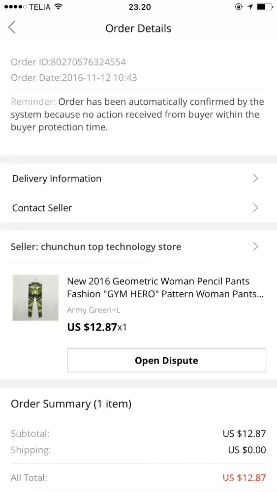 The order was delivered extremely fast on 2017.08.04 which would be perfect if it was delivered to me. I did not receive any e-mail about the purchase was delivered. When I checked the status in the middle of september when the delivery was expected I found out the status of my purchase "delivered" and I can not open dispute because I have got the Confirmation Timeout.