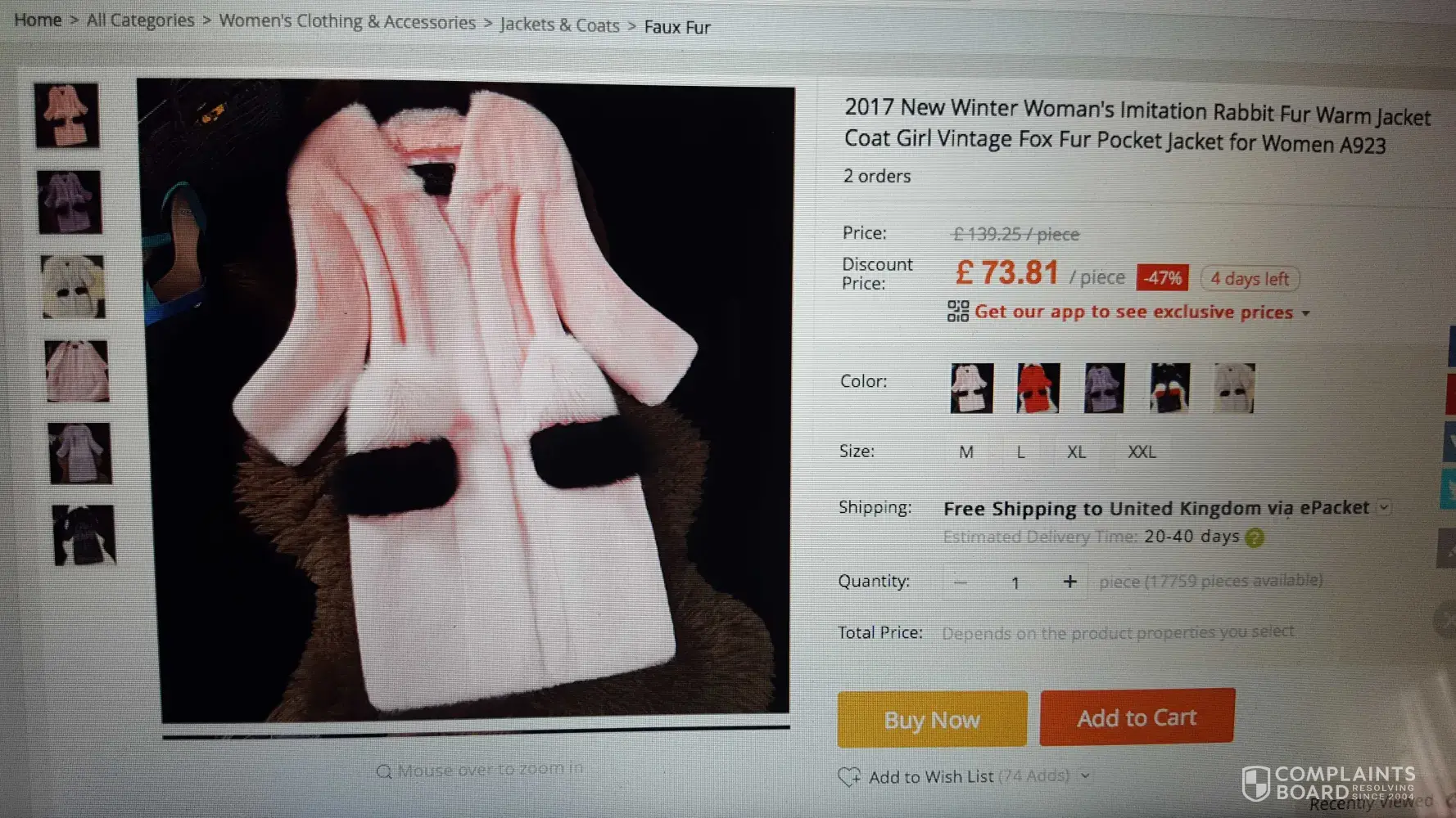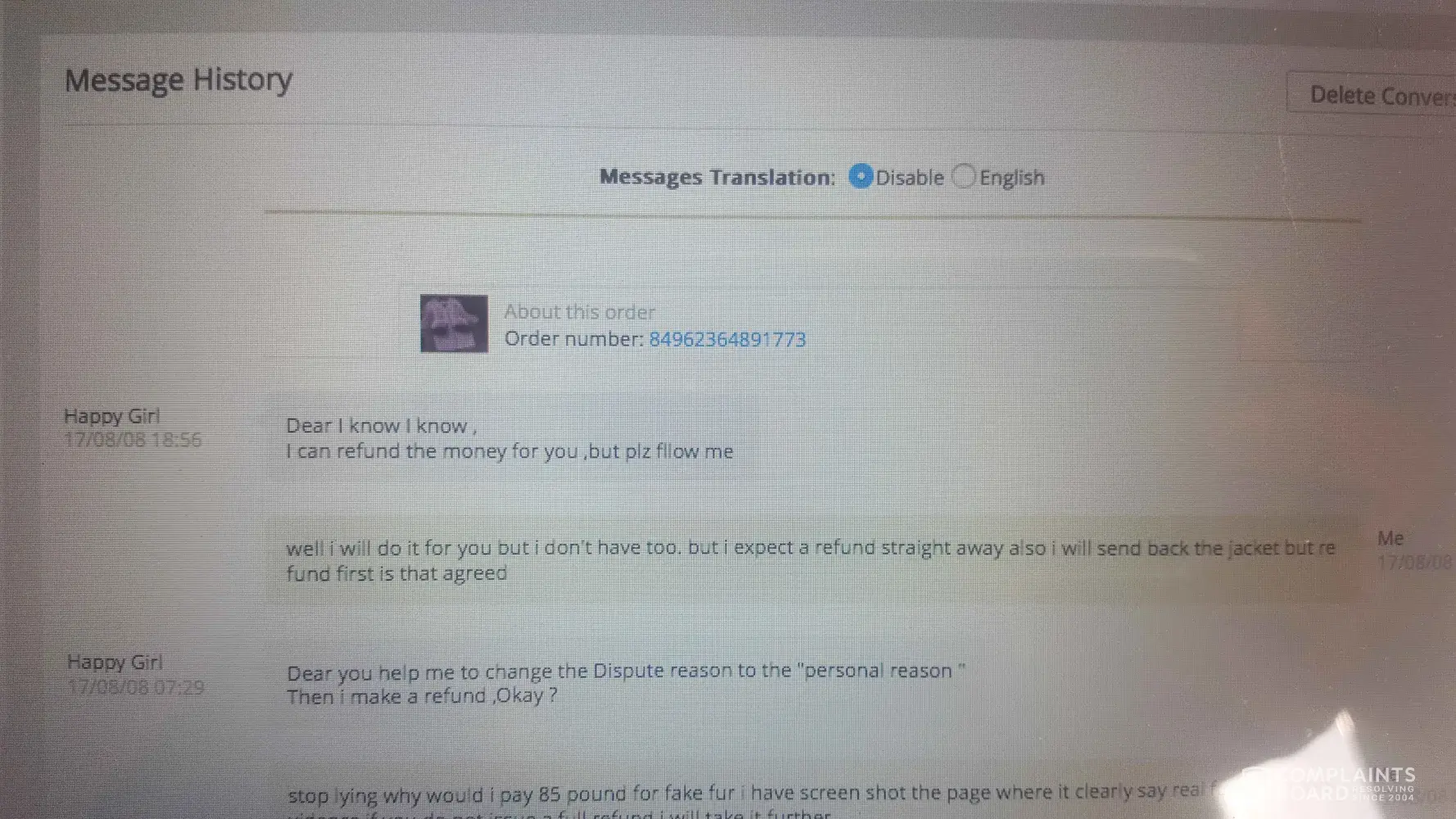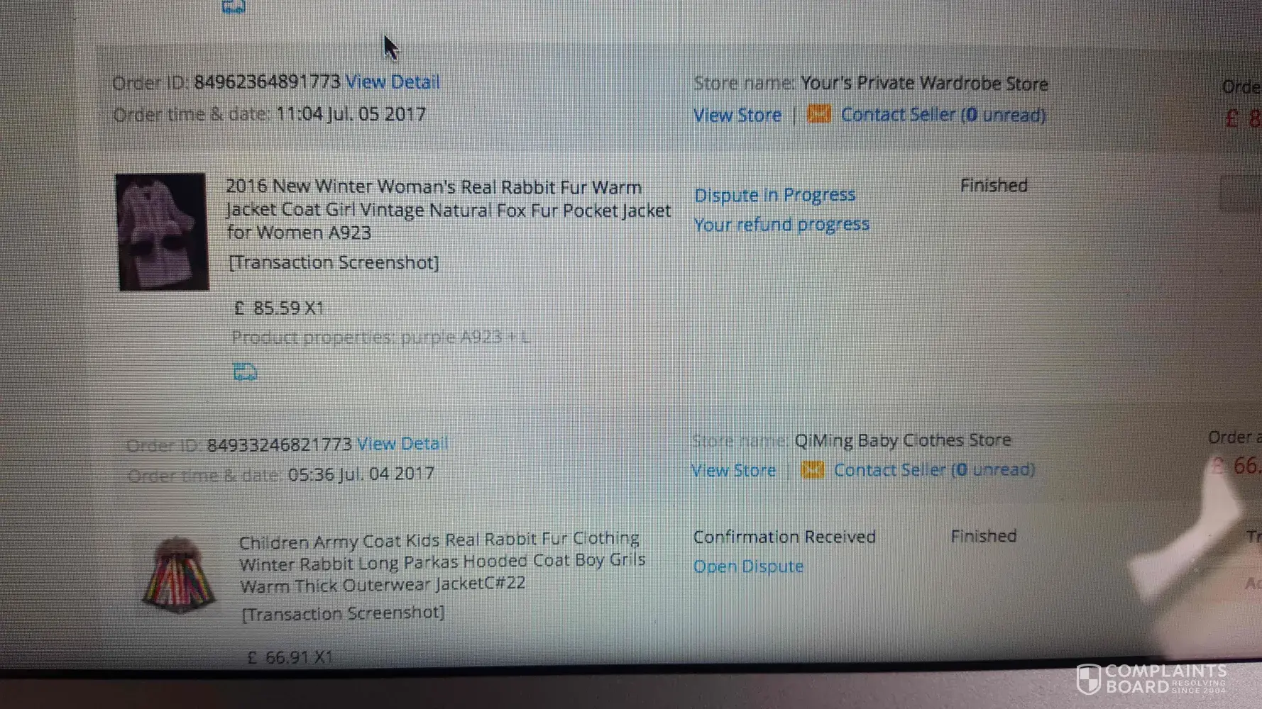 i ordered a real fur coat from a seller on ali express, please see document submitted advertising real fur, when the item arrived it was in fact imitation fur, i opened a dispute and provided evidence of my order and the advertisement. the seller then asked me to cancel the dispute and he would refund me, i decided not to as i did not trust him. the seller then went on to change the advertisement to imitation fur, lied to me and ali express, even though i have provided evidence ali express closed the dispute and will not refund my money