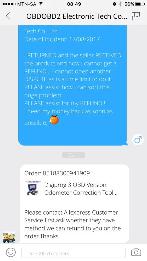 Since then I am keep on chatting with the seller (chat attached), with the life chat (customer care...) NOBODY seems to help me and proceed for a REFUND.