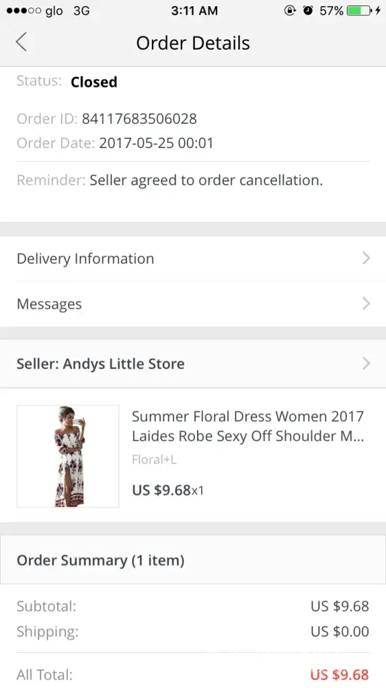 I cancelled two orders from different stores. The first is from Andy's little store with order ID- [protected]. DATE- 25/5/2017. AMOUNT-$9.68