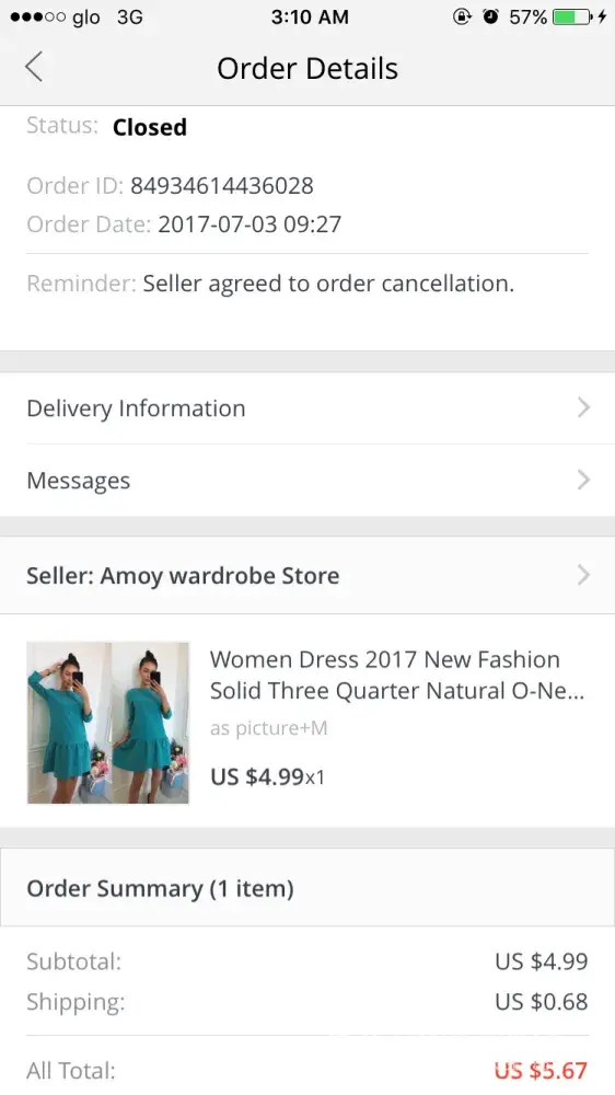 The second cancelled order is from Amoy wardrobe store with ID- [protected] DATE- 11/7/2017. AMOUNT- $5.67. I am