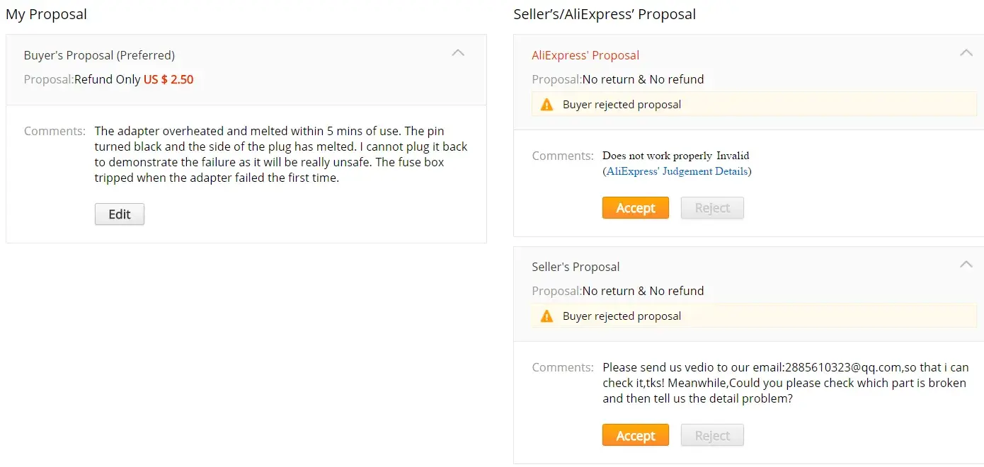 I couldn't even get refund from the order that AliExpress and I agreed for full refund. I accepted their proposal, but then they changed the result and did not pay.