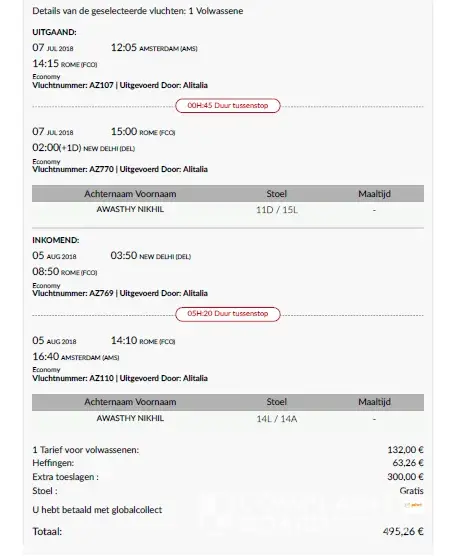 I, Rituparna and my Mother, Ms. Sarbani Pal visited Amsterdam availing ALITALIA flight, to and fro from Delhi as under
