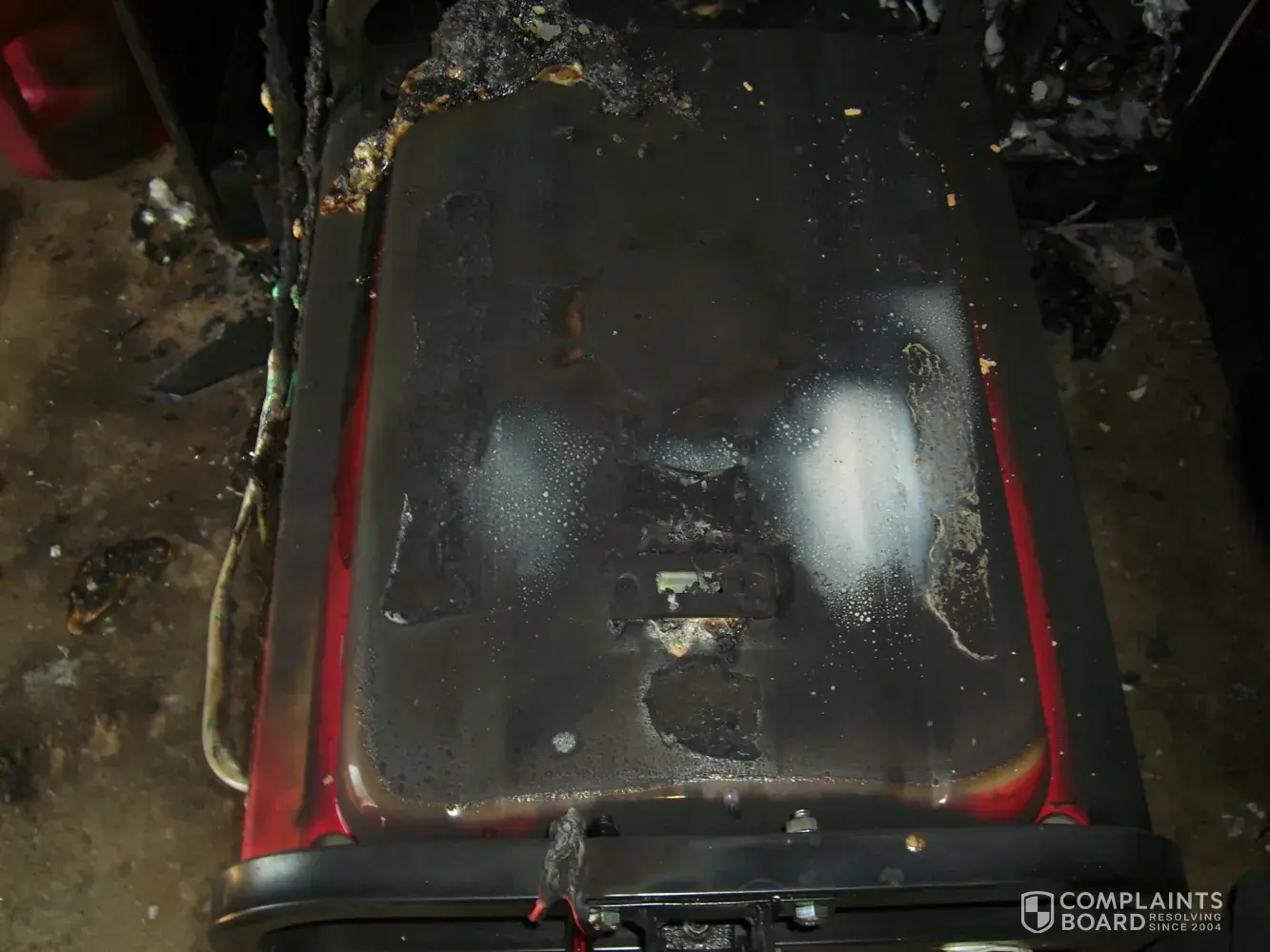 The pictures will show on burned generator the fuel the way it ran down to bottom of tank not burning the bottom of it. I also took fuel gauge and fuel cap off. You can see I raped cap up with electrical tap to seal the sides of it for test to blow on hole in cap for 2 way air flow test cap on new generator and burned one both failed test. You can also tell where the fuel gauge was not sealed to tank and residues on top and bottom of tank both generators show where fuel has leaked. New one around fuel gauge and cap running over sides of tank winding up on petcock and carburetor side of them. I can explain all to U on phone or in person. With parts defective in hand, from both units.Also when U look at burned gen u will notice it was burning from the top of the unit down. like tires burned on top not on bottom, including bottom underside not being burned.