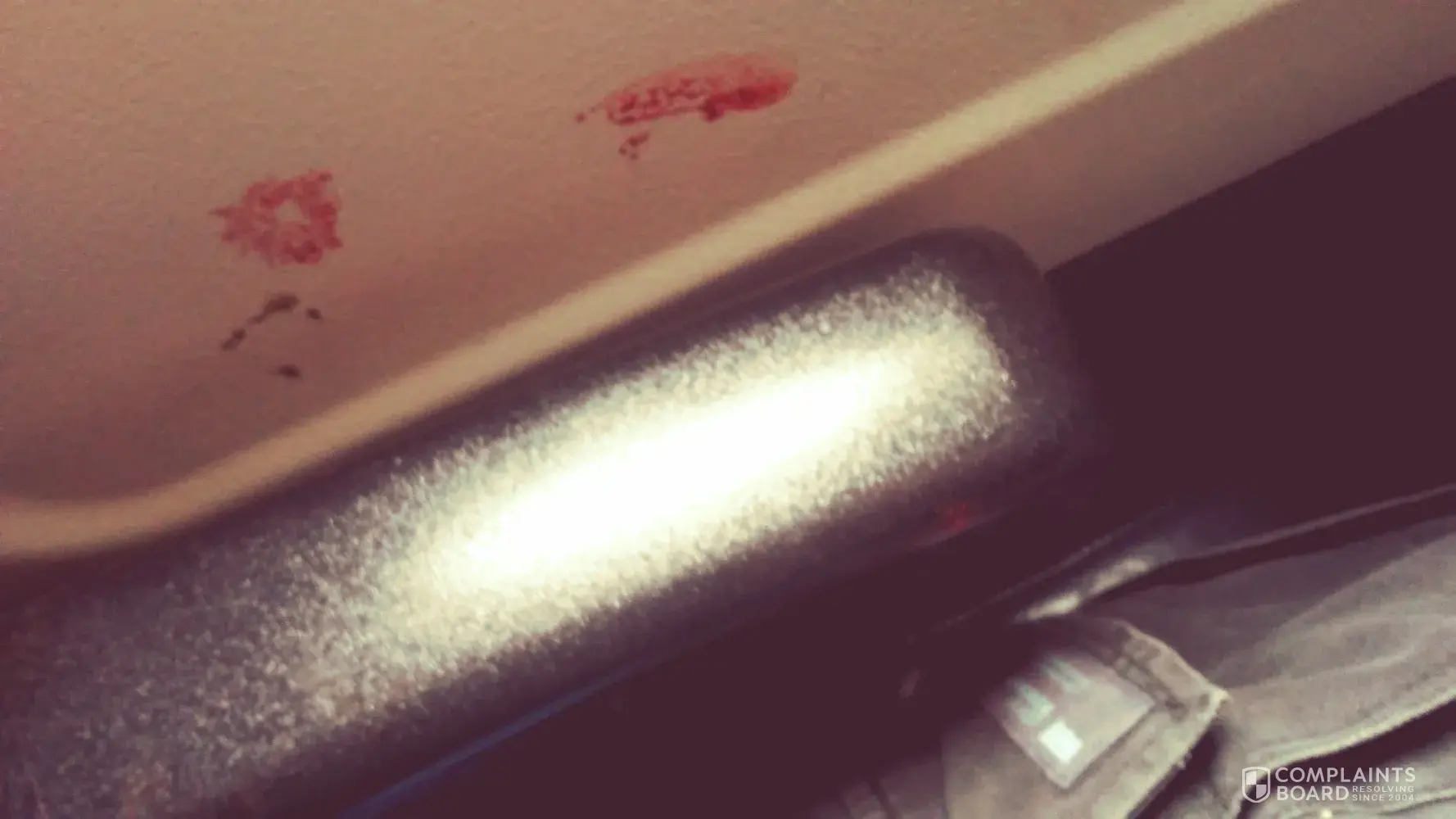 I'm a frequent. User of allegiant airlines. When I boared plane this past july. When I say down noticed blood all over window wall and I lifted my arm and it we all over arm rest. I called the stewardess and told her I needed to move she said I couldn't. She came back with wet paper towel. No bleach no alcohol no nothing to kill any diseases. She wiped it up and left.. That was not sanitary or professional. I've written and called allegiant but they will not respon