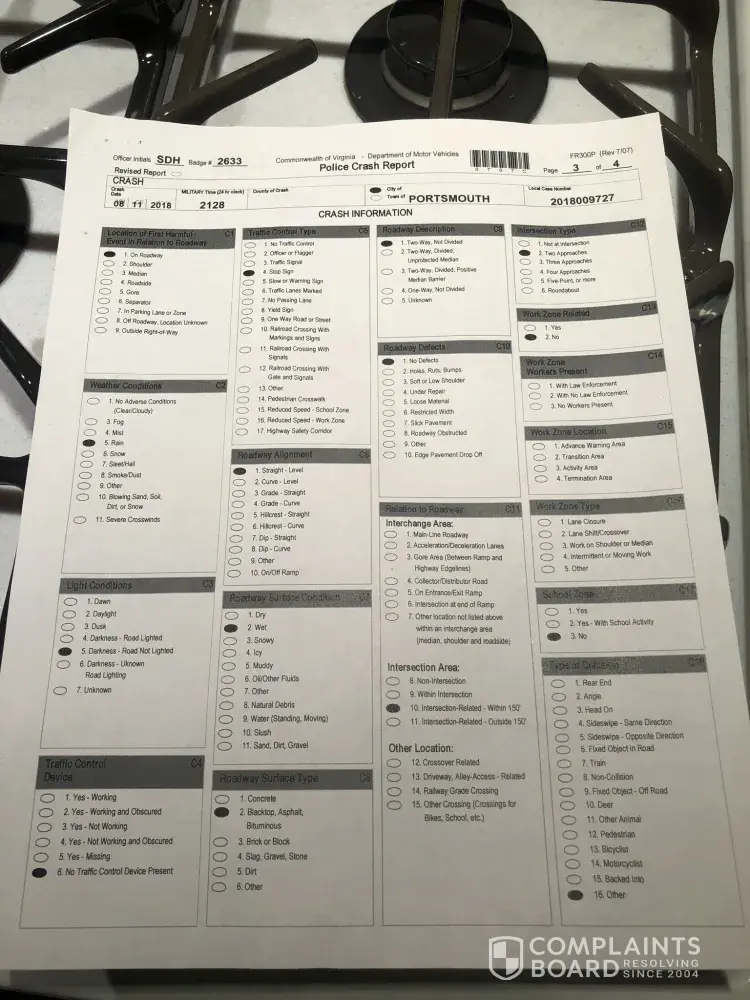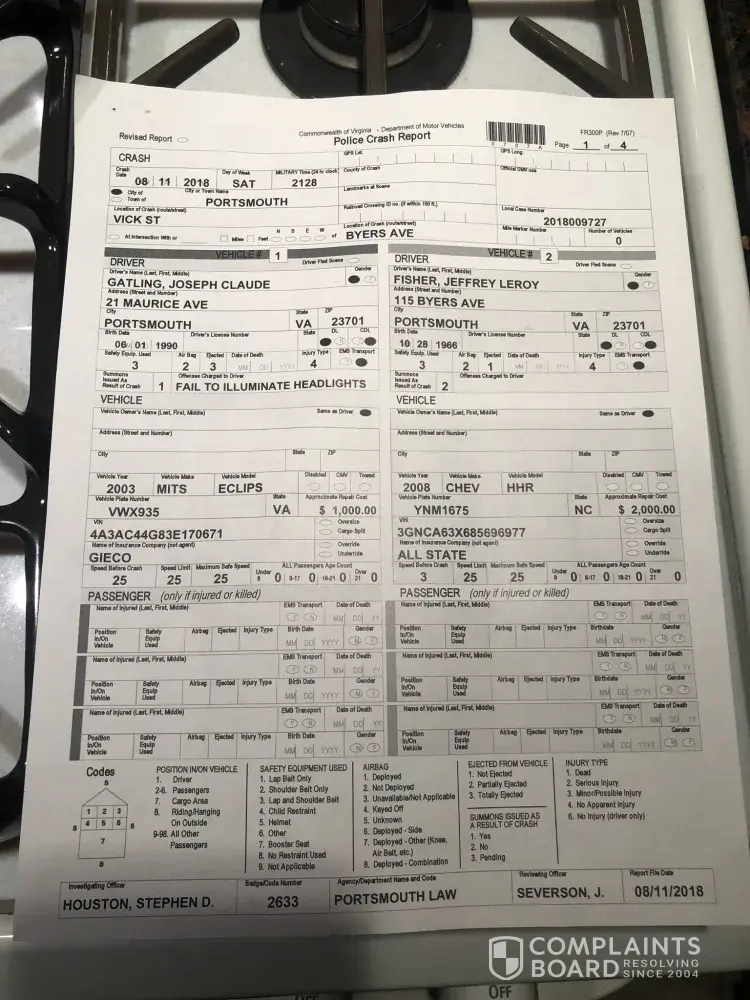 My name is Jeffrey Fisher of 115 Byers Ave Portsmouth VA 23701.I am complaining about a recent accident on 08/11/2018 that I was involved in. I have been with Allstate for over 30 years without any issues whatsoever. The accident was not my fault and the person that hit me was ticketed for failure to illuminate his headlights.My policy has went up 100% because of this