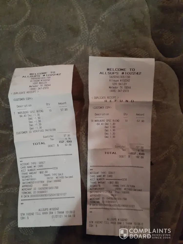Well I was rung up for a carton of marlboro special select 100's and was told to go ahead and run my card before the cashier checked to see if they had any in stock which in no shock to me they didn't so she refunded the transaction but i'm not please with the the training the cashier had and i've noticed time and time again when I got in there they never...