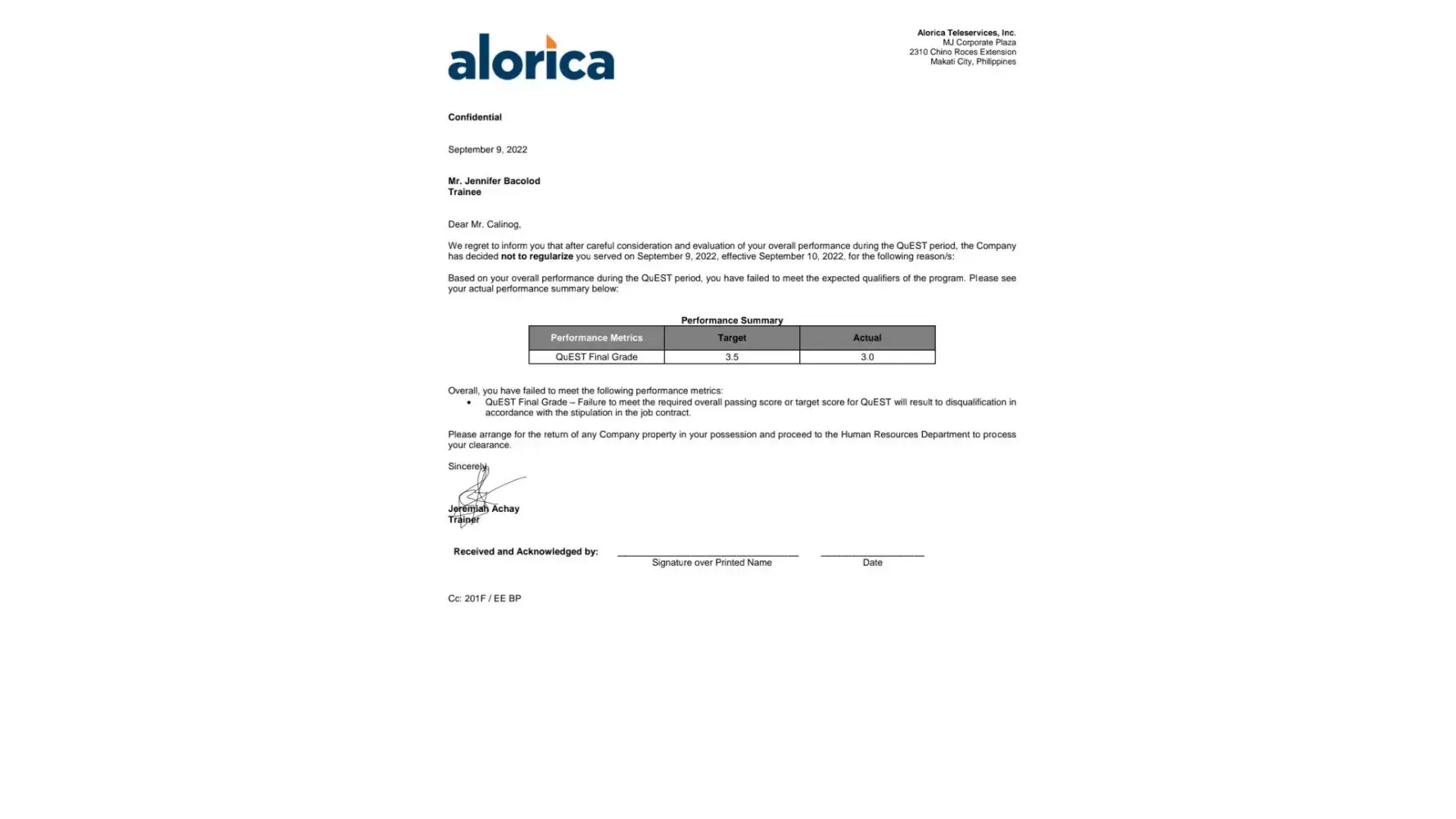 He failed me despite being in attendance 100% for 4 days quest training.I need to to know why I failed in the quest assessment .I am very disappointed with the result of his judgment .I did my best I could so I can support my 2 month old baby who was born with congenital cataract.I will never forget my trainor Jeremiah Achay from Alorica Center MJ Plaza site Philippines. He said that when we help to the people in need we have brighter future. I always reach out my help to other especially with my co-trainer always being attentive to the class and I dont see any thing that will result for me to failed. I have only one wish I chatted him in the group that my phone is hard to touch that is why I send my message twice on our mock chat stimulation, I absolutely respect the rules even I think it's unhumanitary. I'm very sad because of this miss fortune hoping you can give me another chance.because I really want to continue to become part of the company hoping that my applicationnwould not ends because of I only failed due to some technical issue.