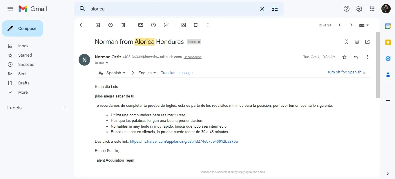 It should be noted here that I had already passed the required language test/screening with two recruiters before I was sent for the final interview. The initial contact was with a Norman Ortiz, a recruiter. From Mr. Ortiz was passed onto Ana Matamoros who does a second evaluation and language interpretation skill test.