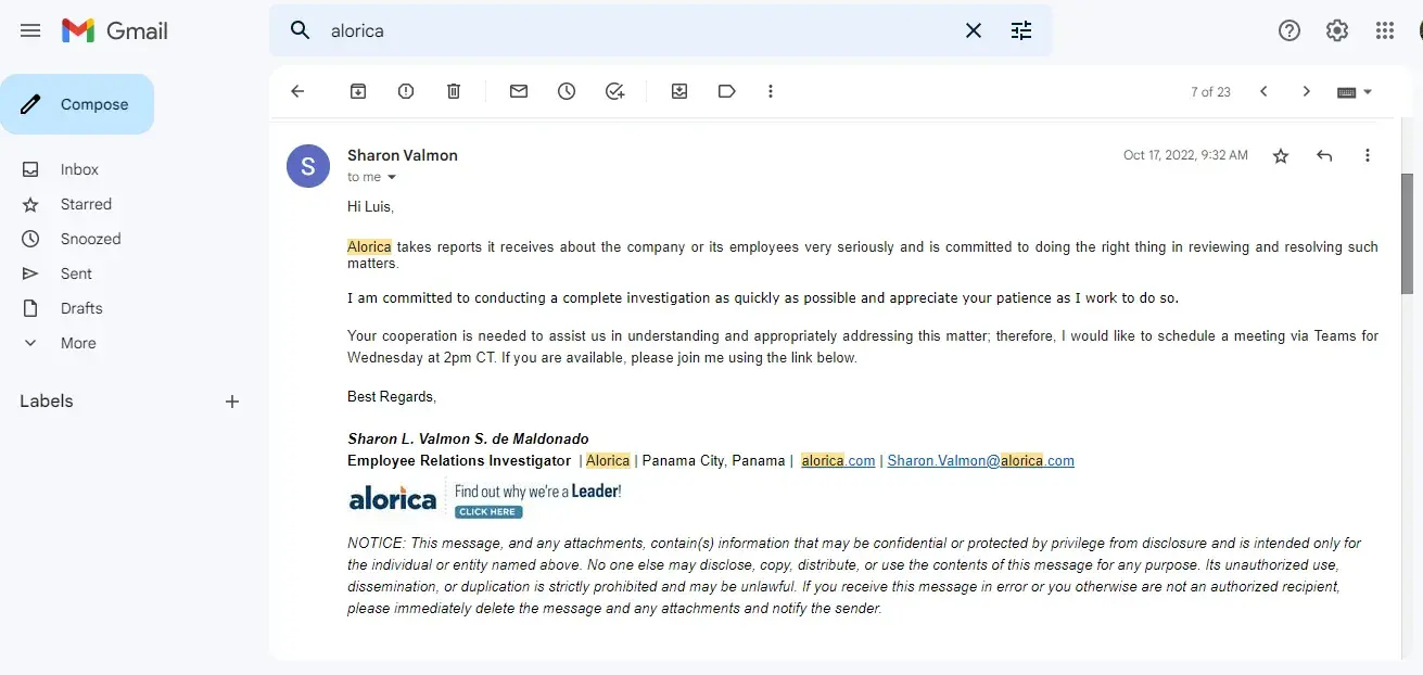 As you know, Alorica has been investigating a report you brought to the company’s attention. We appreciate your patience as this matter was reviewed. I am writing to inform you the investigation has been completed. Based on its investigation, the company was unable to identify any misconduct or other violation of company policy based on your reported information.