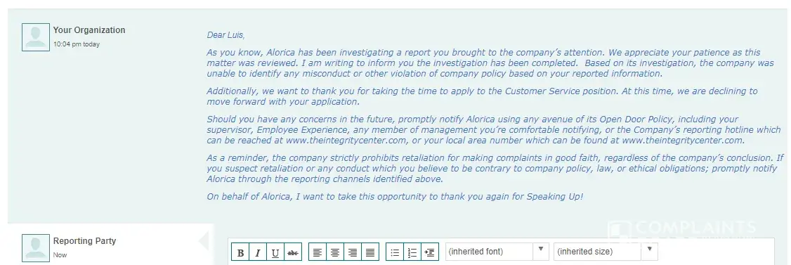 Read full complaintAlorica complaints: history and resolution overview