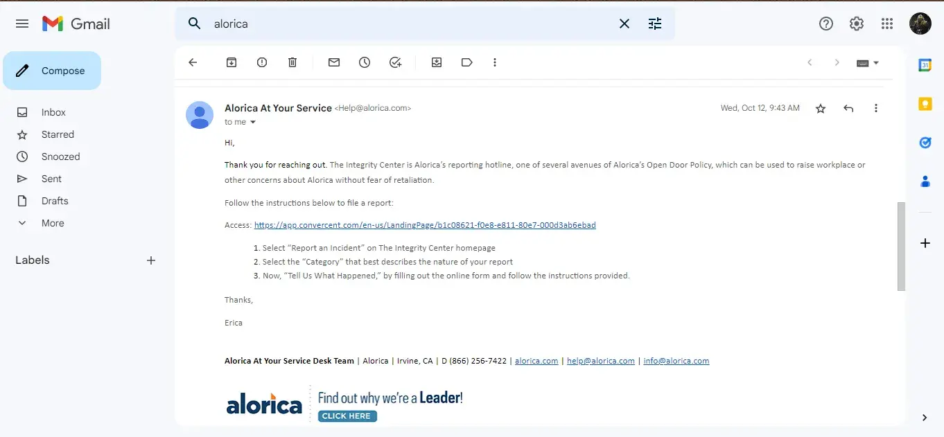 Should you have any concerns in the future, promptly notify Alorica using any avenue of its Open Door Policy, including your supervisor, Employee Experience, any member of management you’re comfortable notifying, or the Company’s reporting hotline which can be reached at www.theintegritycenter.com, or your local area number which can be found at www.theintegritycenter.com.