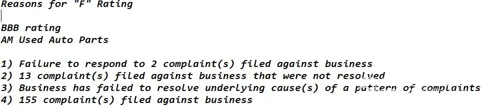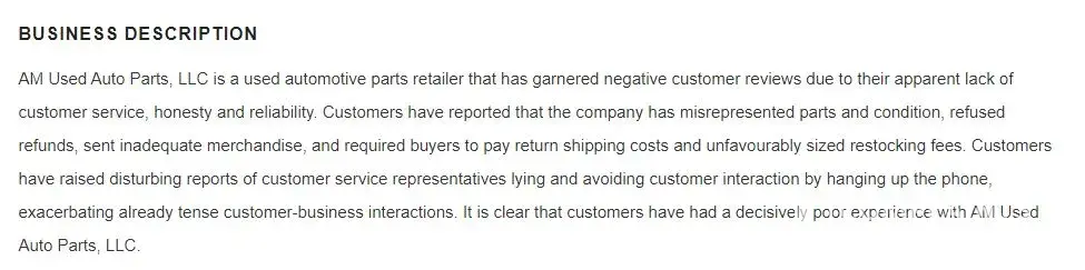 AM Used Auto Parts [AMUAP]’s earns a 1.0-star rating from 0 reviews and 38 complaints, showing that the majority of customers are dissatisfied with purchases.