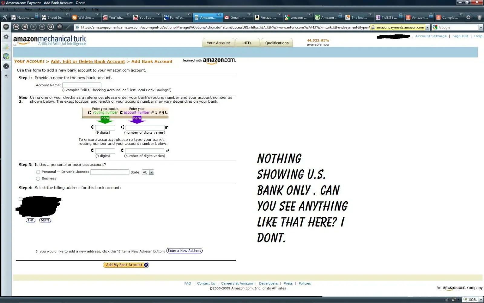 You must have a valid U.S. driver's license in order to disburse funds to your personal U.S. bank account. If you have a U.S. bank account and driver's license, you may enter the appropriate information through Mechanical Turk and then disburse funds to your account.