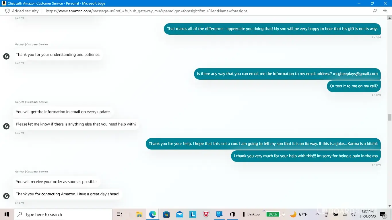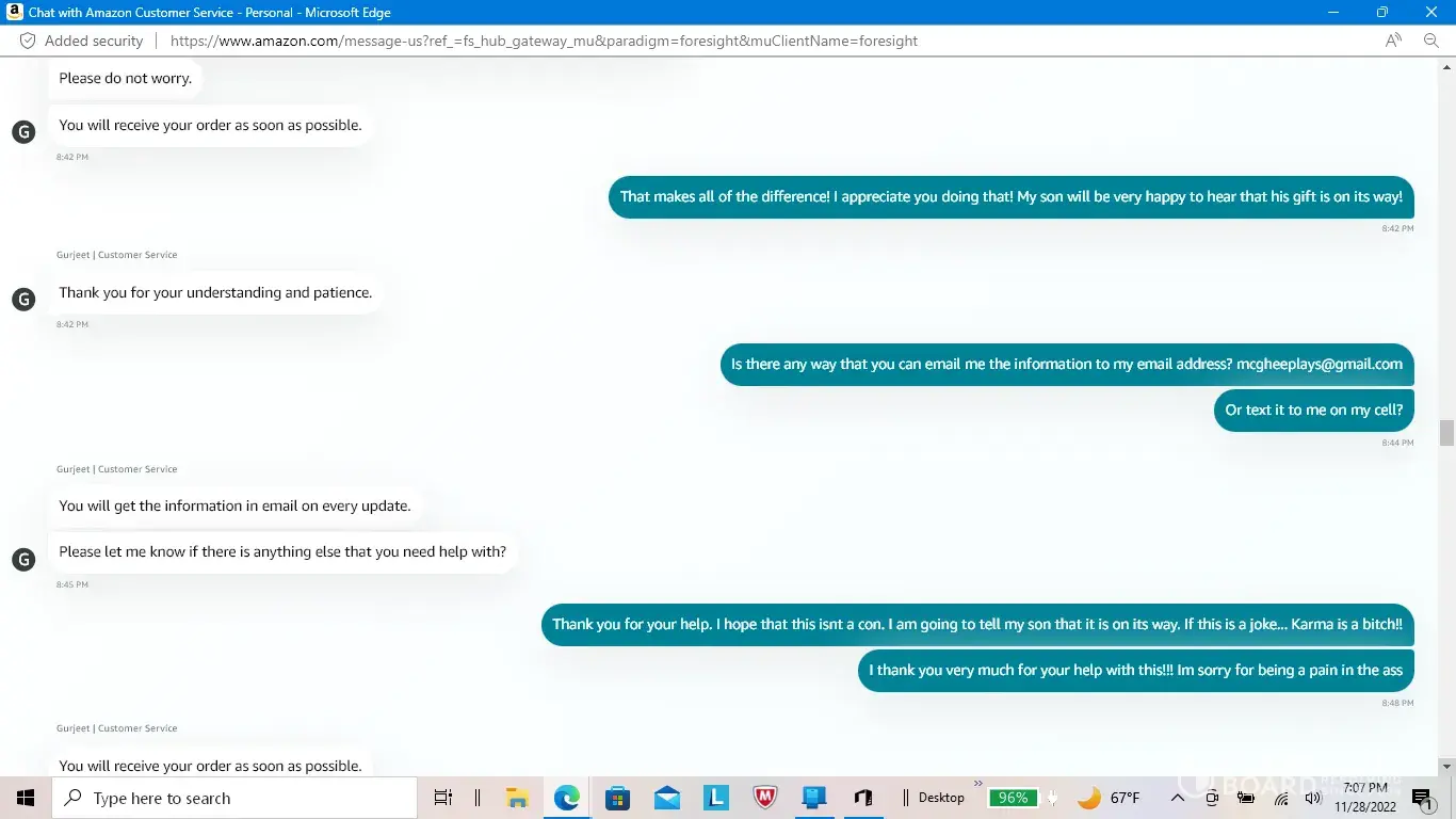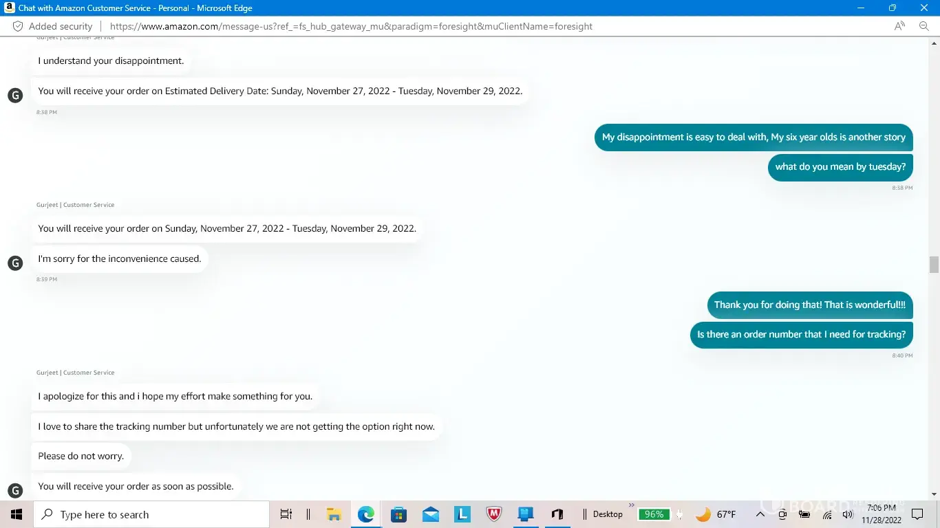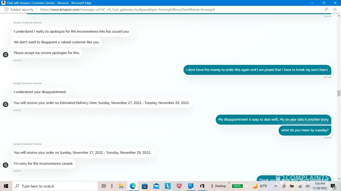 I placed an order on November 16, 2022. The purchase was for a birthday gift for my son that just turned six years old. He wanted the Trac-e robot from the Spidey and His Amazing Friends cartoon show. He was so excited to be getting it that he would ask me every time that I spoke to him. I was also getting a Monster High Doll for my seven year old daughter to replace the one that she had recently lost. I didn't receive any email or other type of notification that my order wasn't going to be shipped due to a payment issue for eleven days. When I got the notification, I no longer had the money to pay for the items. Due to the fact that I had put the money into a friend's account to be able to make the purchase with their card online. They hadn't been able to check their account to see if the money had been taken from their account. I don't have a debit or credit card due to some issues that I am not going to go into. I contacted Amazon's customer service department to find out why it took eleven days for them to notify me about the issue and they eventually told me that my order would be delivered by the 29th of November. I thanked them for taking care of the issue and was under the impression that they were sending the order and covering the costs of the entire order and shipping due to the failure of their system to notify me of the payment issue. I was very appreciative of them compensating me for the issue that had been caused by their automated system's lapse in communication that was going to break my children's hearts. I asked them for the tracking number so that I could let my son and daughter know when to be expecting their gifts. The customer service agent, Gurjeet, told me that he wasn't able to give me that information at that time but that he would email me the details and that I didn't need to worry about it, that it was all taken care of. I left a very nice review and was extremely happy with the outcome that they offered and the issue that didn't need to be stressed about. The next day, I hadn't gotten an email with the details of the order being compensated by them and the tracking number. I did receive an email telling me to update my payment info so that they could ship my order. Confused, I contacted the customer service department again. They told me that they reviewed the chat from the day before and didn't see that Amazon was going to pay for the order and ship it to me. The agent that I chatted with the day before said that my order would be there by the 29th, and that I didn't have to worry about it. That he didn't want to lose an important customer like me and that he was happy that his efforts could help the situation. He didn't actually say that Amazon would cover the costs, he only said that it would be there by the 29th. I was confused as to why I would be told not to worry about the situation and that my order would arrive by the 29th if the cost of it wasn't being covered by Amazon. The agent told me that they sent me two more emails today about the need to update my payment info. He said that there was nothing more that he could do and that he was ending the chat session. I accept the fact that I should have the money to purchase the gift for my children myself and that it is not Amazon's fault that I don't have the money to pay for the gifts at the moment. However, I could have taken care of it before I paid my bills for the month. During the eleven days that it took Amazon to let me know that I needed to take care of an issue with the payment, I had the money to make sure that this didn't happen. The automated system that finally informed me of the issue could have notified me earlier and this whole situation could have been avoided. Confidence in humanity has been destroyed, just like my son's heart because of not getting his birthday gift. THANKS FOR NOTHING AMAZON!
