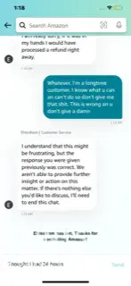 I have been shopping with amazon for years and never had a problem until about 3 years ago and it's been horrible every single time. I will give specifics in a moment. I just have to say one incident 1st. My passed away right before I started school this year, so I got a lot going on to begin with. well with my extra school money I was planning to buy a laptop, headset, mouse, pen, printer and several other accessories. I was going for a graphic design degree at the time so there was a lot of hardware and stuff I needed to do my education efficiently. well, I went on and ordered everything and it took literally all the money I had to do it. I had an important bill come in that day, so I chatted amazon an explained that I really needed everything but since the bill came, I needed to cancel a lot of the order an get a refund. this lady was very chatty, and I didn't mind so I chatted away. I told her about my mom and my bill, and she said since I had been such a loyal long-term customer and been thru such a hard time with amazon services and with my mom's passing, that she would refund the items I asked to cancel but still send the items anyway. I made her repeat it back to me like 3 times because it sounded crazy! I explained to her that I was fixing to spend every bit of the money on my bill an if she was lying to me that I wouldn't be able to buy any of my stuff. she reassured me several times that I was getting all my stuff and my money all for being a good customer and because they had been doing me wrong and I was going thru a lot. well guess what... she lied. I spent the refund on my bill and never got my stuff. I understand it was crazy to believe but I just couldn't see someone being that low to want to know my whole story just to screw me over more.