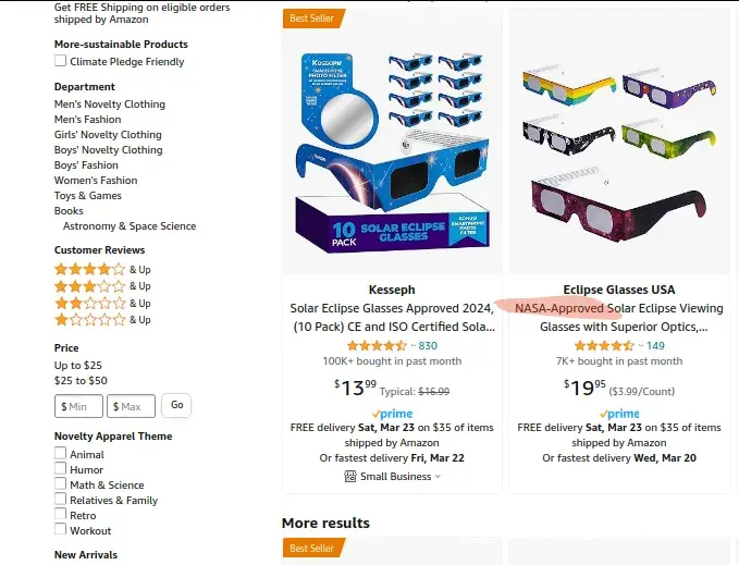 Various eclipse glasses being sold at Amazon site are with questionable standard. These are being sold as “NASA approved†(NASA does not approve any particular brand of solar viewers: https://science.nasa.gov/eclipses/safety/), “AAS approved†(not truthful when not in the list published online: https://eclipse.aas.org/eye-safety/viewers-filters), “ISO certified†(when the certification is illegible) and/or “made is US†(when not), etc. These products, when used by viewers, are serious health hazard, including eye damage and blindness. This is especially concerning when expected number of viewers is a major fraction of US population.