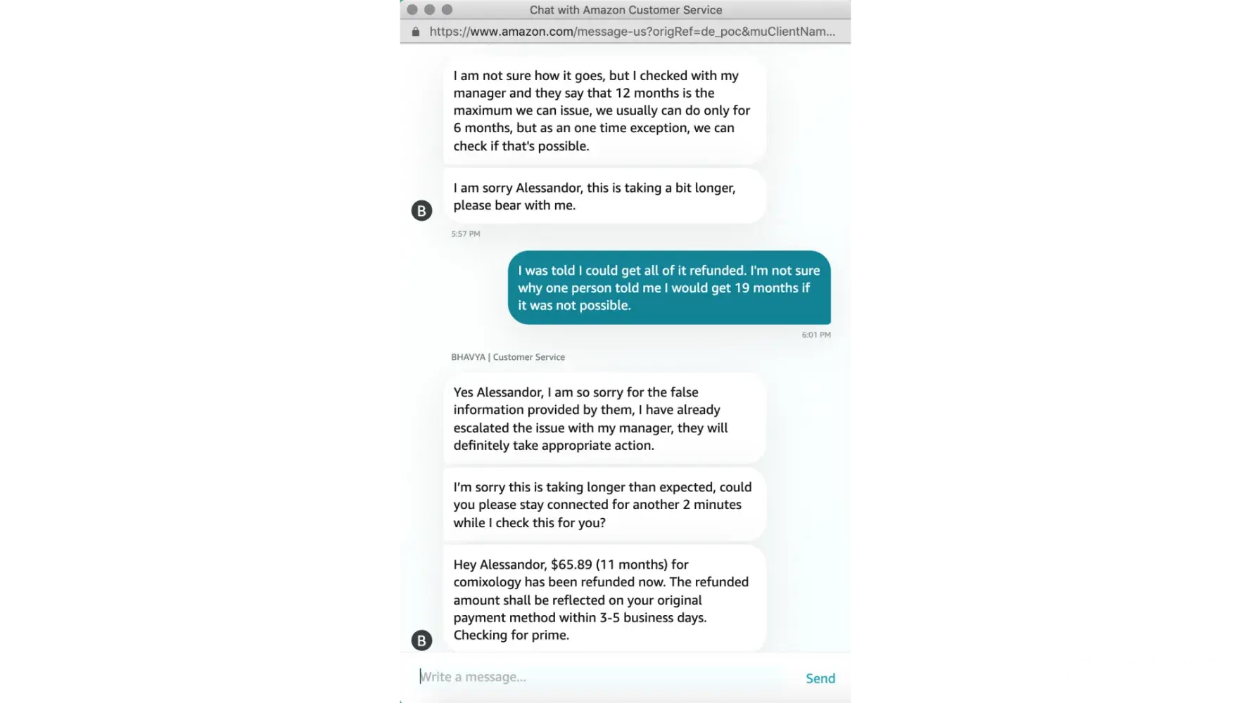 Desired outcome: I would like a full refund of all charges, as promised in writing by Amazon.