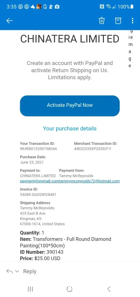 Have not received an order of 5 diamond paintings ordered on June 25 2021.