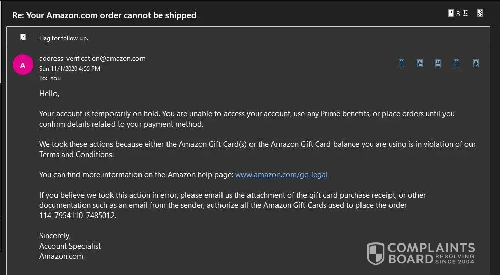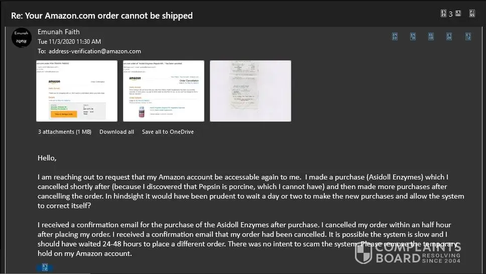 Amazon has placed a hold on my Amazon buyer account [protected]@outlook.com since the end of October. Amazon emailed me asking for proof of receipt for the Amazon card I used to make the last online purchase. I sent proof of receipt for the Amazon card I used. Amazon has not lifted the hold on my account. I want the hold on the Amazon account [protected]@outlook.com to be lifted so that I can use the account again.