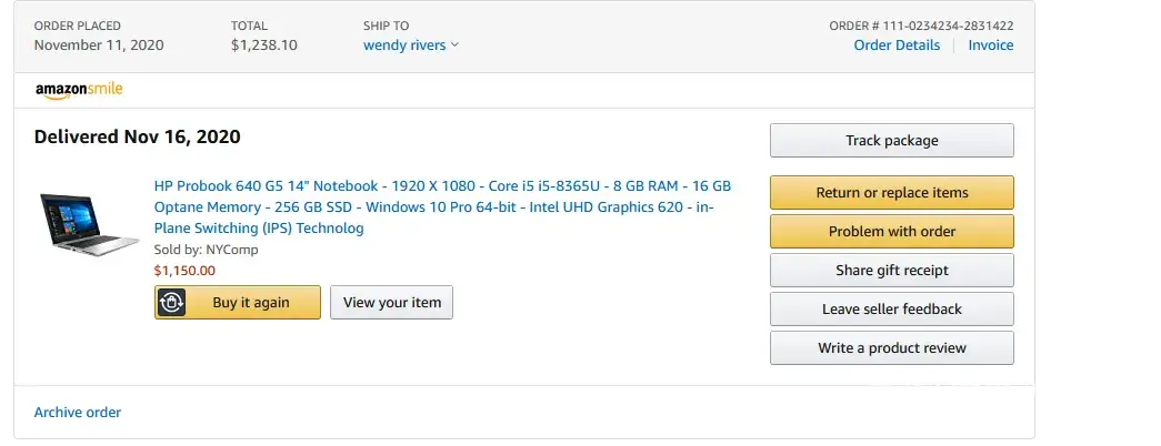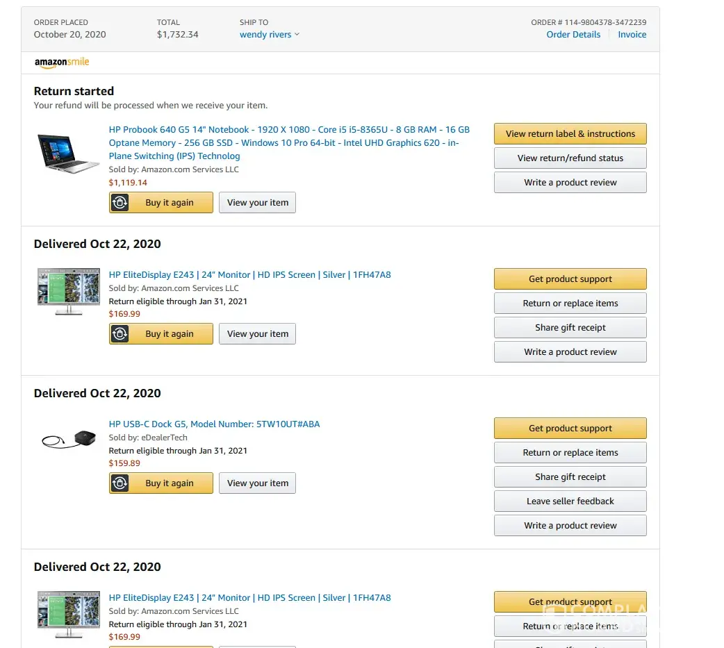 On October 20th 2020. I purchased a HP Probook 640 computer that did not work. I was sent a return label. I used the buy again option to purchase another one on November 11th 2020. Since I needed a computer to work from home. Once it arrived I used the return label amazon sent and put the one that did not work in the box the new HP Probook came in and returned. Amazon said i returned wrong one. it is not the wrong one, it is the one they sent me that didn't work properly. I asked them to send it back so i can see and they refused to do that. I have attached an email with more specifics.