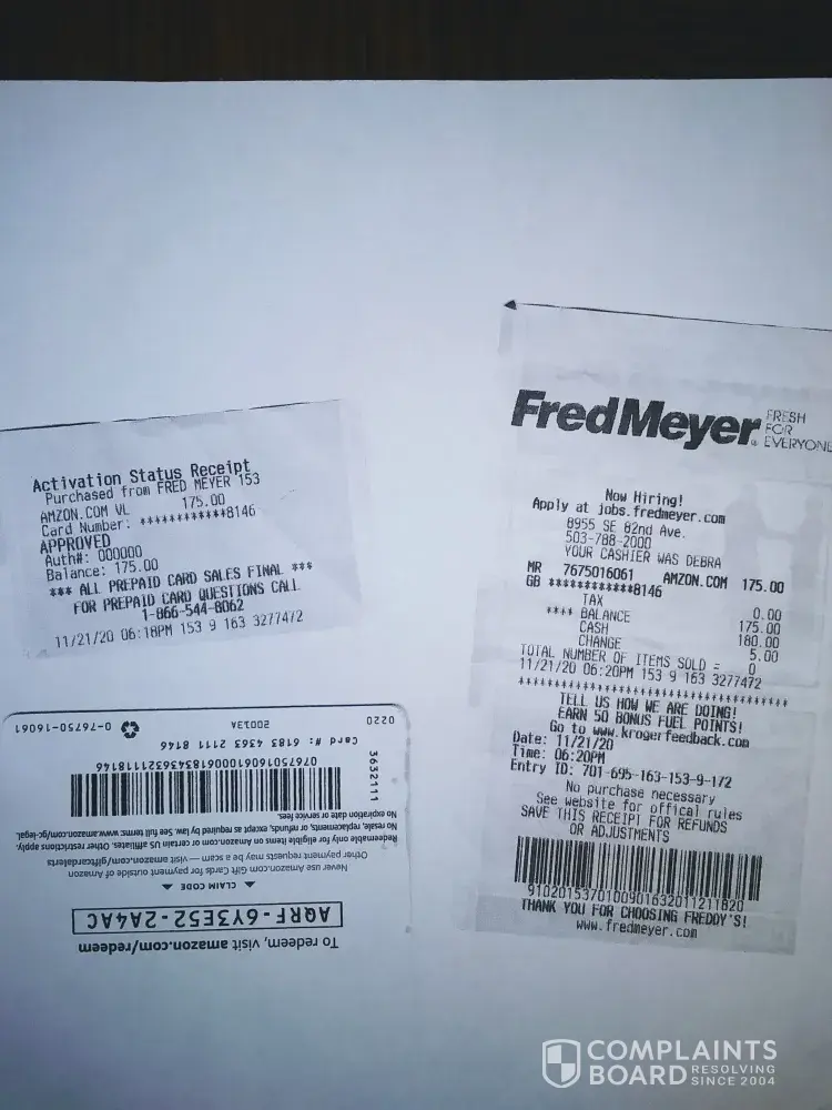 I then logged back into my amazon account, filled out a form, and provided the following three items. 1. A copy of my amazon gift card receipt, a copy of the actual black gift card 3. an Activation status receipt. To prove that, I purchased my amazon gift card from a local Fred Meyers. Fred Meyers is authorized to sell Amazon gift cards.