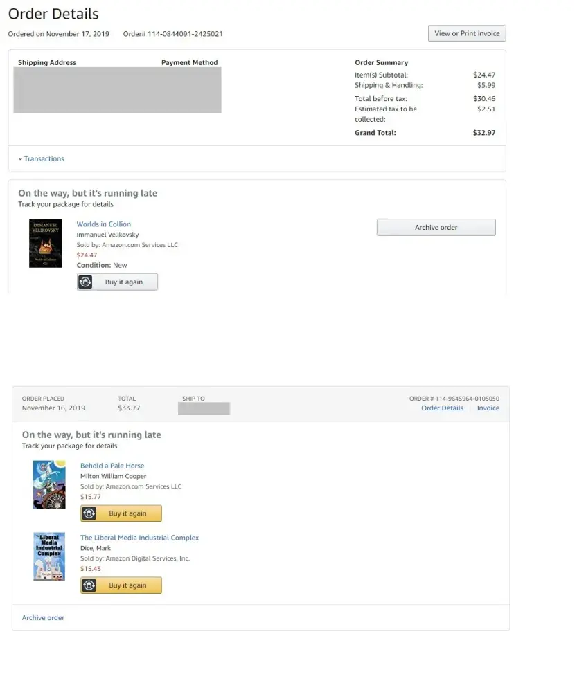 I ordered 3 books from Amazon back in November 2019. Every time I went to their site to check on the orders their message said my orders were on the way but running late. Then when the Covid thing started happening their site says shipments may be delayed because of that too. The track my package option was grayed out so I couldn't track my packages either. When I finally go tired of waiting I went to their customer "chat" and "chatted" with Leon who said there was nothing I could do at this point because they only give you one month to sort this stuff out after you have placed an order. Why the heck then did they keep saying my orders were on the way but running late? I know $67 and some change doesn't seem like much to a company like Amazon but to me it shows they lack integrity. They could have at least offered store credit or something to make up for THEIR mistake.