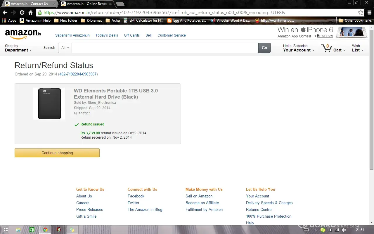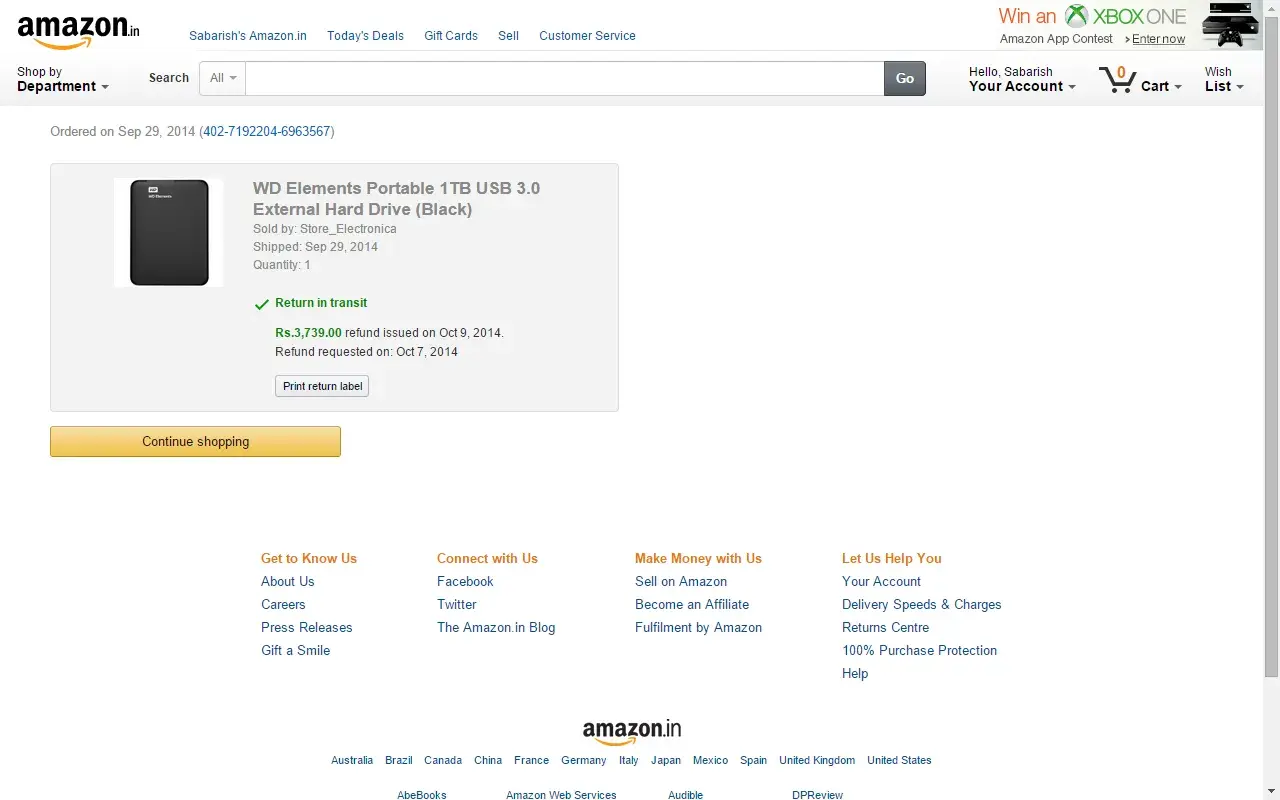I wish to bring this to your kind notice that I had placed an order, WD Elements Portable 1TB USB 3.0 External Hard Drive (Black) (Order # -[protected]) on Amazon.in on Sept 29, 2014 and received the product on Oct 7, 2014. Unfortunately the product was not working so I placed return request on Oct 7, 2014 and the product was picked up from my end by Amazon.in on Oct 9, 2014. The refund amount (i.e, ) 3739 INR was to be credited to my account on or after Oct 9, 2014 but till today (Nov 07, 2014) the amount has not been credited. When I contacted Amazon.in on this issues several times after I initially checked the status of refund on Oct 14, 2014 they provided me with the NEFT Payment Transaction ID – [protected] and added that the refund was initiated on Oct 9, 2014 and also suggested me to check my bank statement. After I checked my bank statement, I contacted Amazon.in and informed that no money was credited and also provided a soft copy of my bank statement on their request.