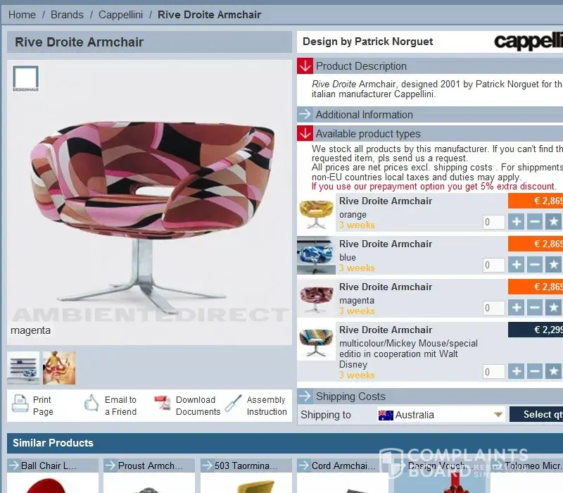 I already complained on another site and I will keep on doing it everywhere. If I don't get my furniture this week I will take legal steps. I payed more then 2000 euro, 2 months ago and still no news! I got 1 e-mail after a public complaint and then silence AGAIN! They apologized, promised me to send my order and send an e-mail when it's sent, but silence AGAIN after that mail. REALLY? I'M SHOCKED HOW THEY CAN GENT AWAY WITH THIS. AMBIENTEDIRECT IS THE WORST ONLINE SHOP. KEEP AWAY FROM IT. THEY REALLY SUCK. CAN'T BELIEVE THEY ARE STILL IN BUSINESS.