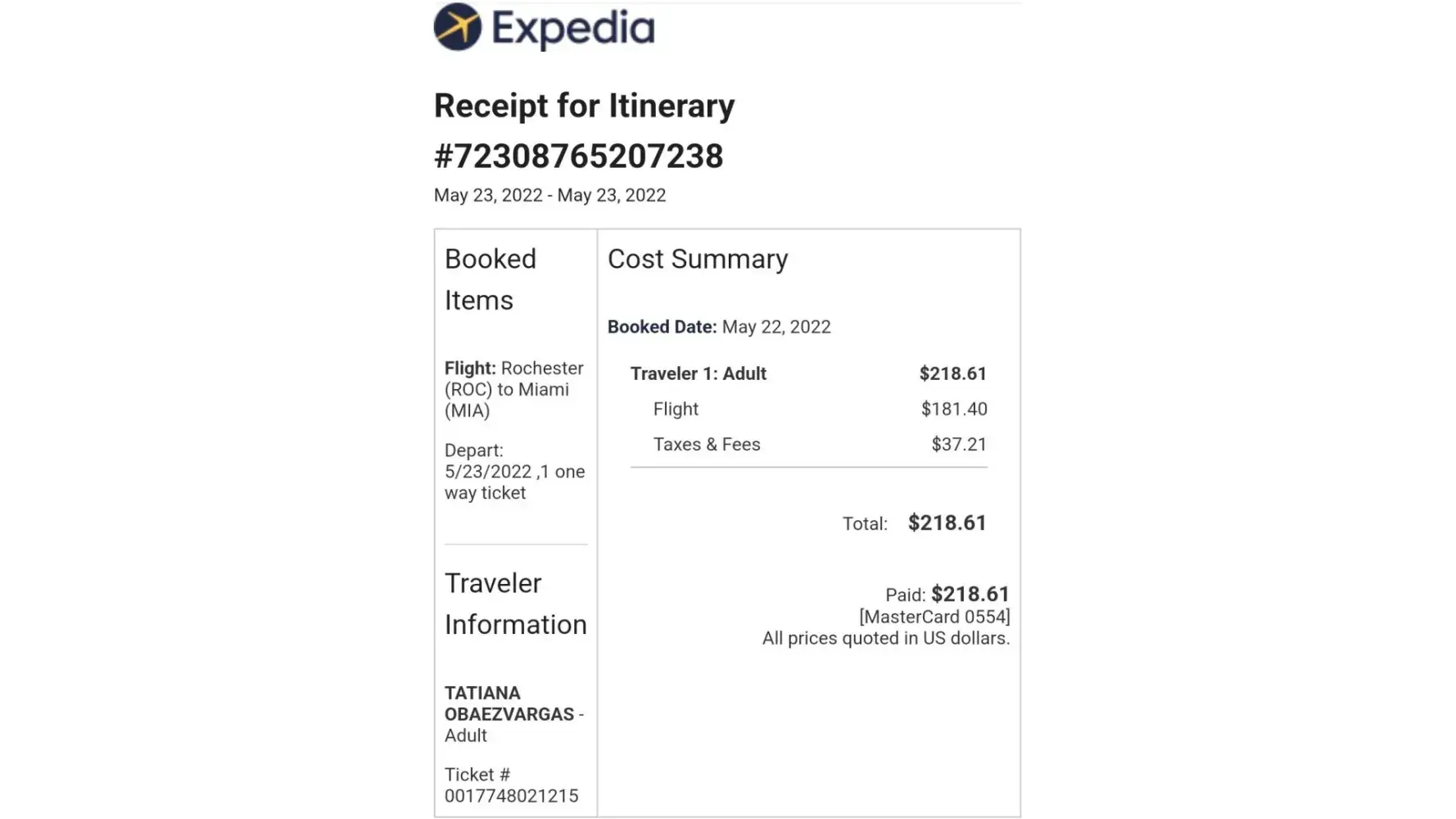 Ticket # [protected] Return Flight