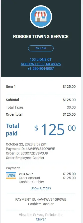 Now my husband had to pay $125 for towing Oct 22, 2023.