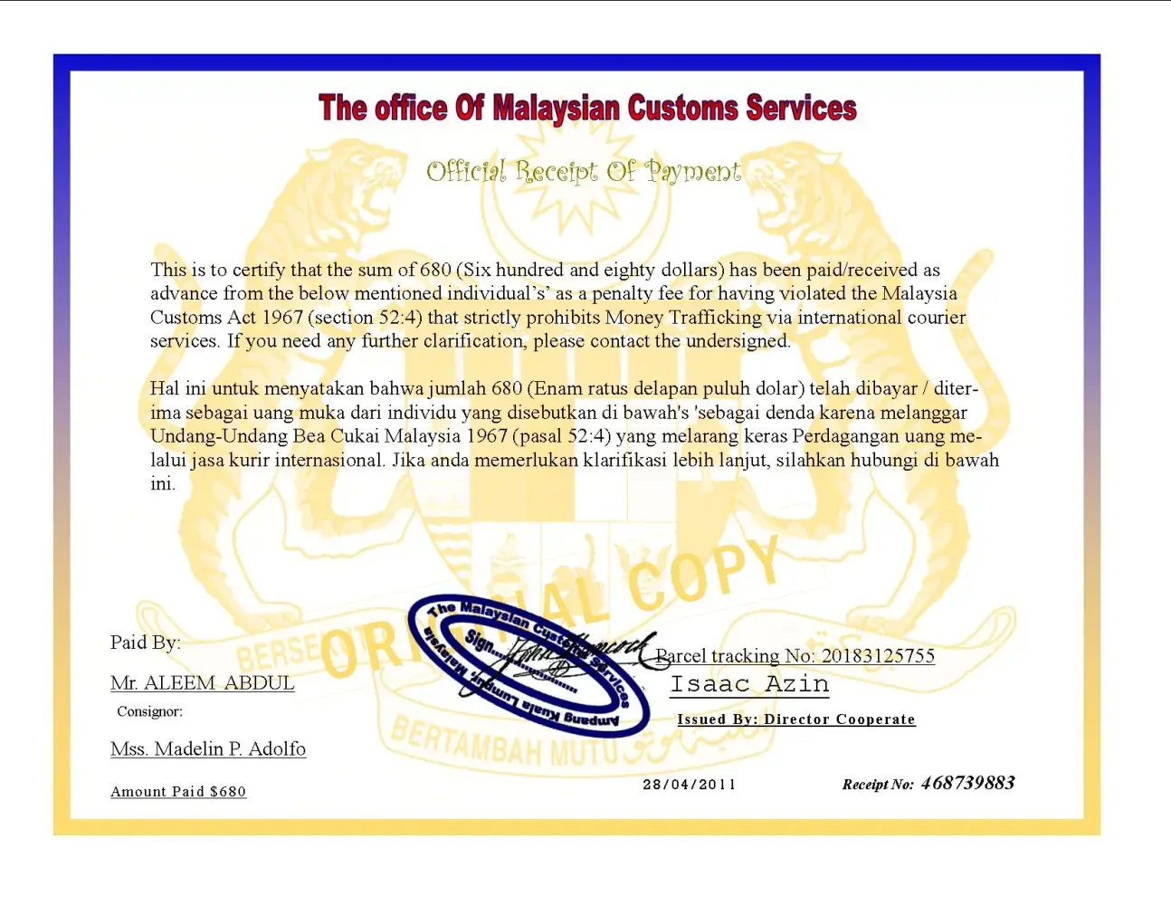 After the payment has been made for the penalty I was hoping that my package will be delivered to me. I again received an email from director rashid aaida informing me that the malaysian customs still withheld my package because I have to pay again for the insurance of the currency inside the package in the amount of five thousand eight hundred forty two and 71/100 myr (Myr5, 842.71).