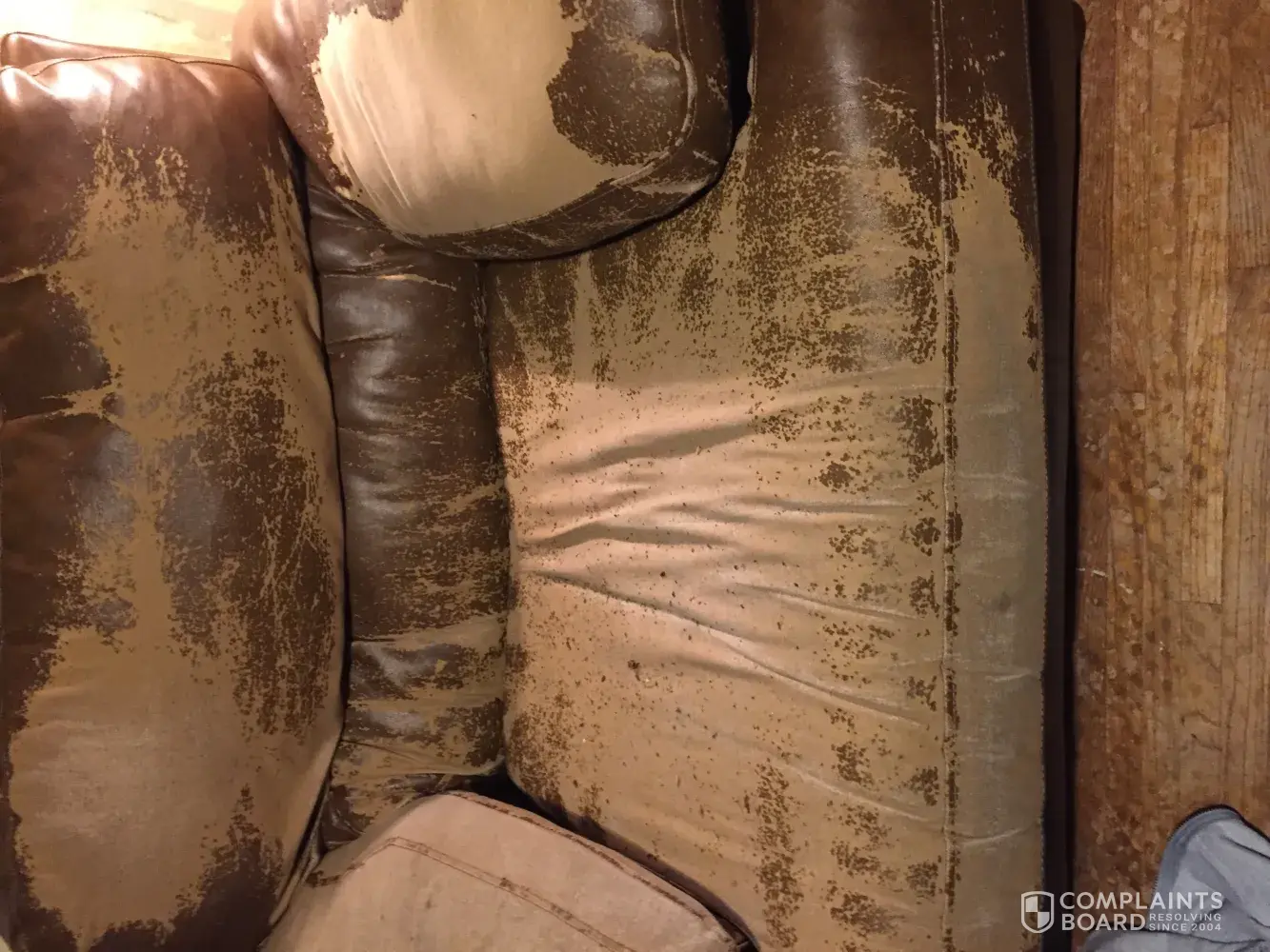 We bought sofa and chair and a half in 2010. It's completely peeled all over and has sunk so far down we have boards under couch for support. This is worst furniture that we have ever bought. Right now remodeling house so keeping. Otherwise would have places to curb years ago. It's frustrating to spend hard earned money on junk. It started out with one spot wearing away and then before we knew it peeling everywhere. It's been peeling nonstop so much I would've thought it would all be off by now. But no. It's just sticks to you and trails crumbs of coating all through the house. Very frustrated. American in peoria went out of business and with furniture like this I can see why. Not sure how you can make it right but wanted to pass on.