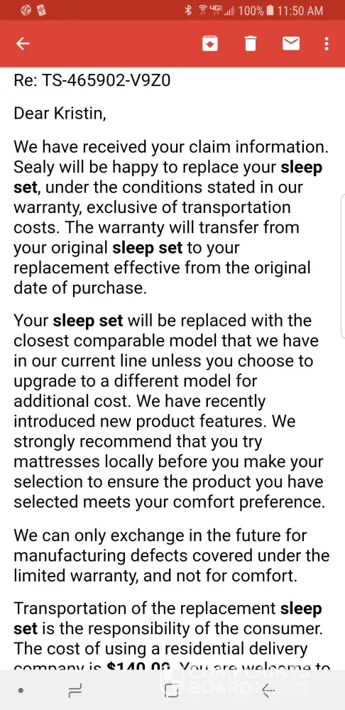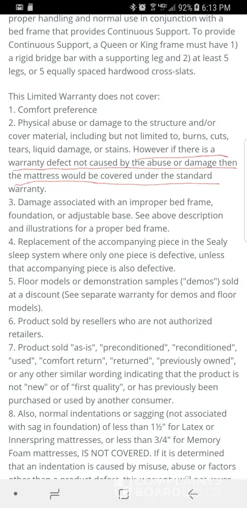 UPDATE: I further contacted Sealy and reviewed the information provided/findings that AFW provided to me. I have received an email from Sealy who states that they will replace my sleep set. I have included screenshots of the warranty information from Sealy and the response from Sealy.