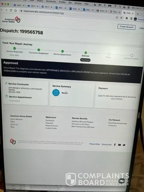 I called AHS and was told that is not true. That the repair company had not yet filed a report with them. Today, a Supervisor, AJ, called from AHS to tell me she was following up on this and would get back to us as soon as she heard anything. AJ called on 2/22/23 and told me the same thing and said the repair company is not responding.