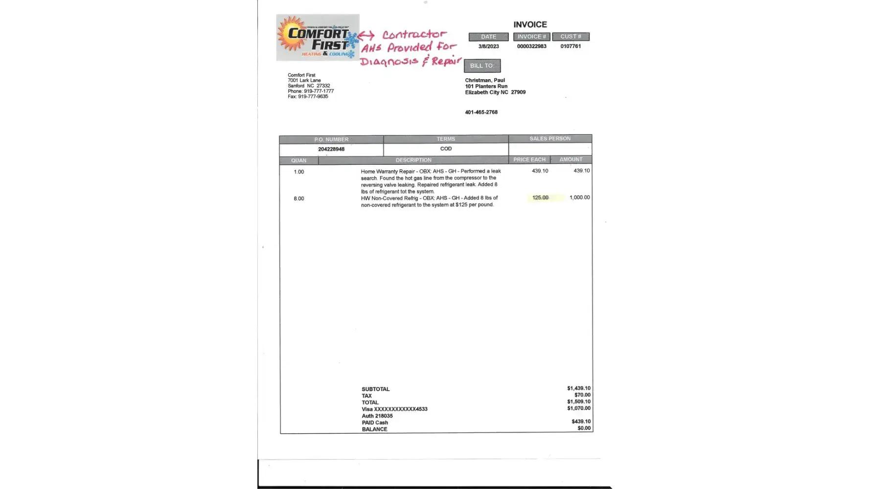 (AHS Contractor) Comfort 1st ïƒ Refrigerant $1070.00