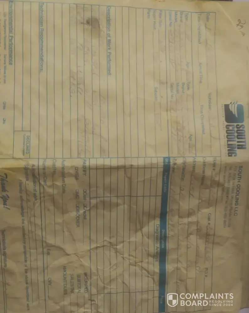 The man came out to my home and once again, never checked the AC Air Handler or the Thermostat and began working on unit outside. The receipt said he replaced old compressor with a new one and he had to weld and cut to do that. That's when he says the AC unit was checked for leaks and he found one but everything else was ok. He would send someone out to follow up. I have been without AC for a month at this point. Two days later they sent another man (Three different People to work on my AC). This man said I had to pay $320.00 for the Freon before he could start repairing it. I was angry at this point wanting to know why that much and it wasnt reported until the second man came out. He had no answers so I said go ahead because my wife is handicapped and its too hot in our house and I wrote him a check and signed receipt before he left. He finished within a couple hours and left handing me receipt everything was good which it wasnt. It's December 11, 2020 and when he left I cancelled the check because he lied. It wasnt working and still isnt. And neither the company or AHS has remedied my problem. There is nothing marked where there should be on how much Freon was taken out of unit and how much was put in and nobody had checked the Air Handler or Thermostat and South Cooling wants me to drive to Miami and pay them $320 before they come out again. I have complained to AHS for almost 3 months now and still have nothing done. I had a private company come out and tell me it looked like no one had done anything to unit. So I took pictures of what I could. Hopefully to prove my point. I'm calling AHS back today to find out what's next and than I'm cancelling the renewal of my contract also which is due this month. They also sent out a company to fix my Ice maker said it works now but it don't.