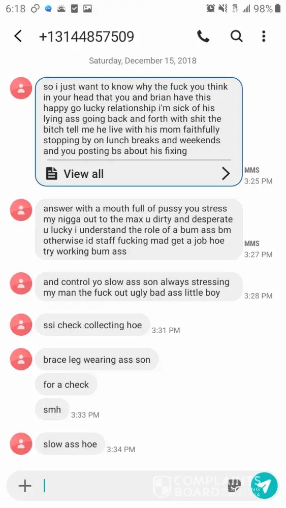 Regina Johnson my son grandmother have been sending disturbing messages to my phone about my disabled child, by her son Brian. Regina and Brian other child's mother Jasmine have been playing on my phone. Brian Foote' and I have broken up over this on going harrassment. I'm not understanding of how a women who works for the community can constantly engage in such negative activities. Regina is a manager at one of the St.Louis Red Cross locations. Just last week she tried to report me for child neglect, while I was in the Hospital. The police came to my home, and after showing proof of my whereabouts the police didn't file a report. I have witnesses of the situation to prove my case.