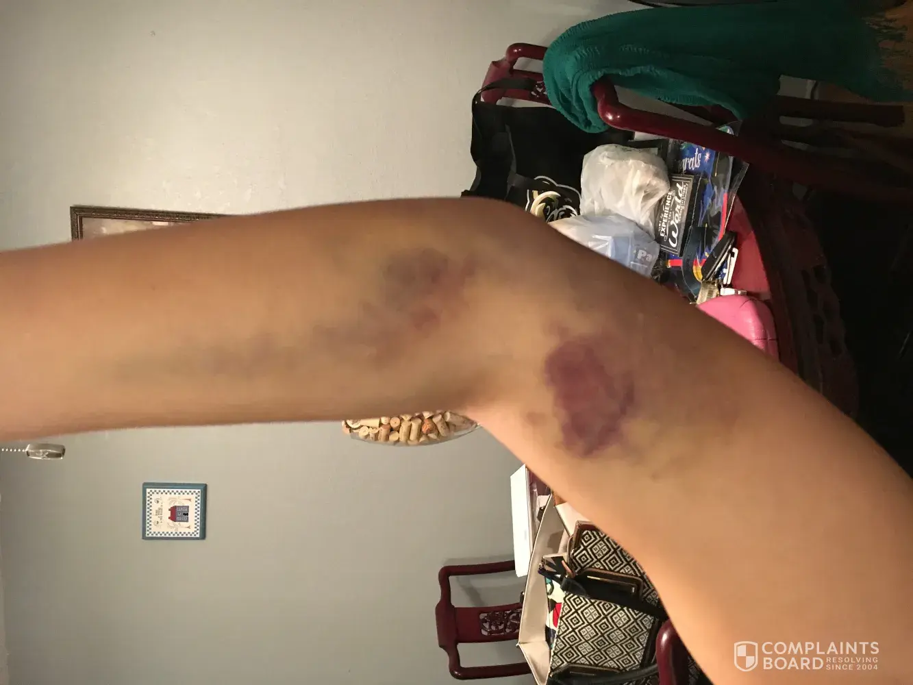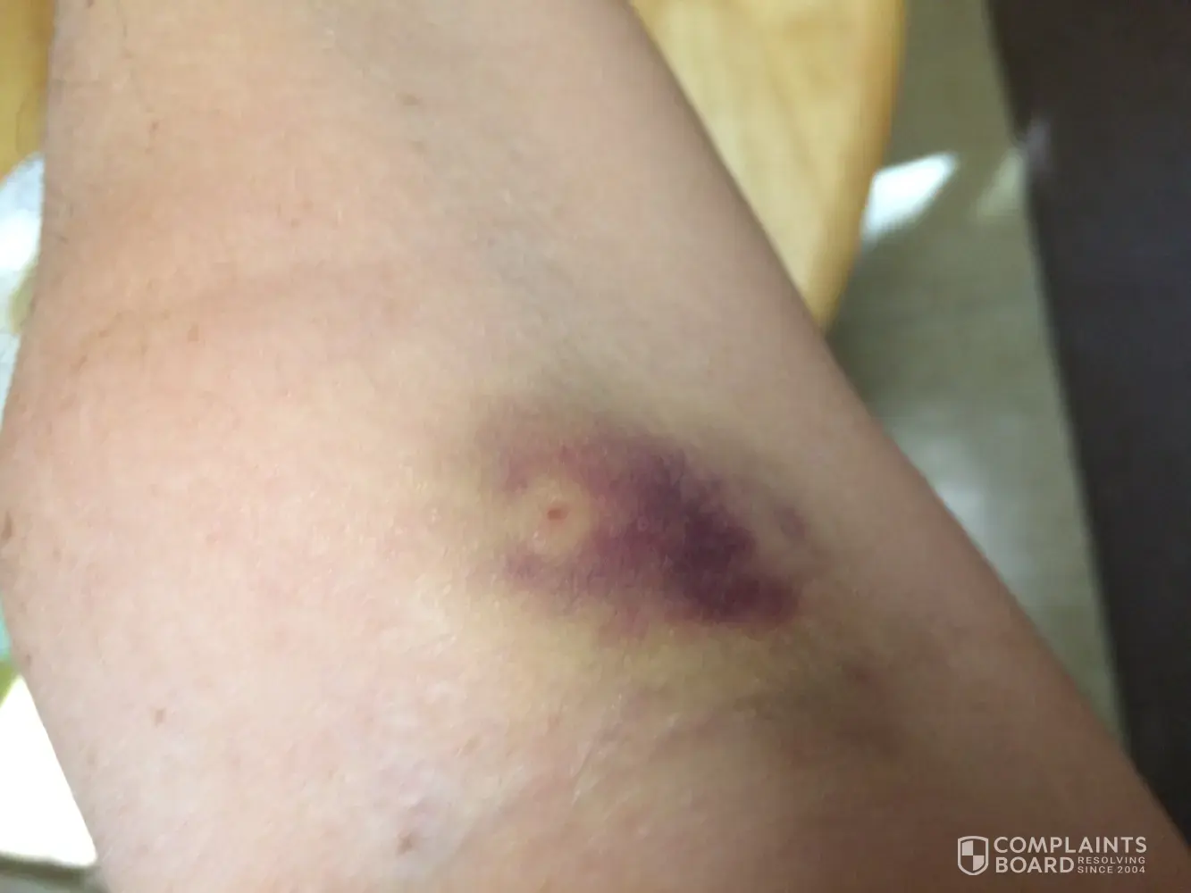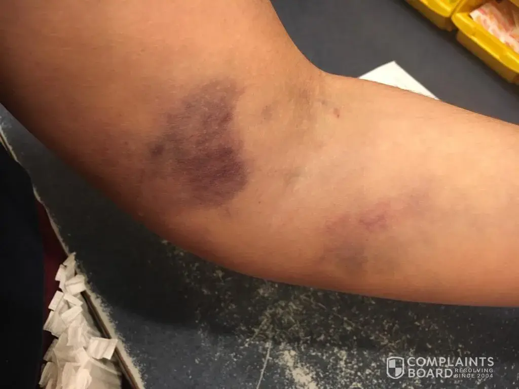 I gave blood at the Red Cross Donation Center on Prince Street in Rochester, NY last Thursday--a pint of AB+. I do not recall the name of the technician who inserted the needle in my arm. However, she had problems and I wish to complain regarding the damage to my inner elbow, left arm I suffered. It took the form of a deep angry bruise which, after 4 days, has not yet abated. It is still accompanied by a feeling of heat or pressure there.