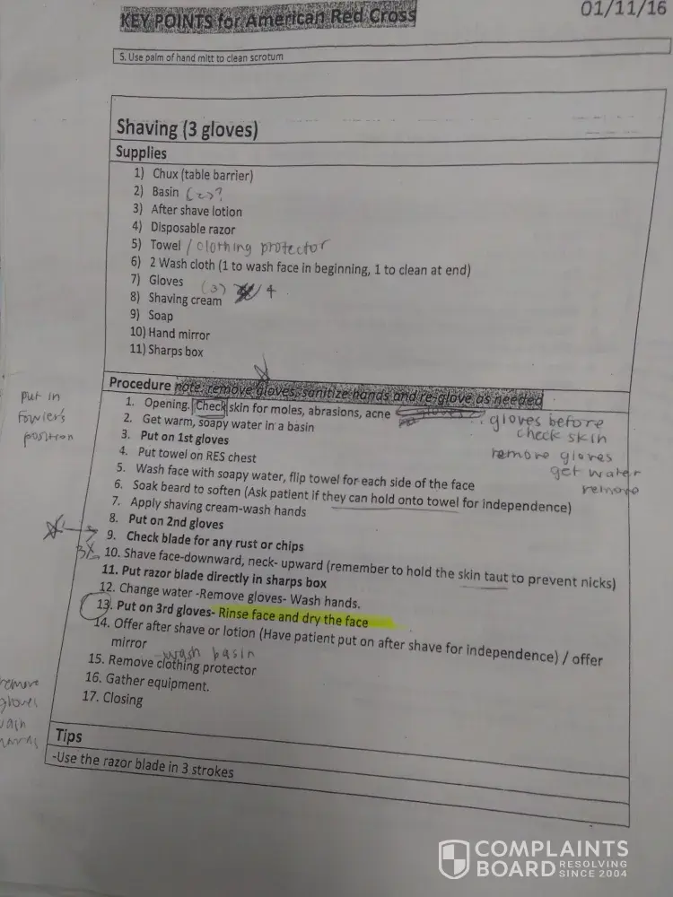 For personal care, I drew the card "Shaving" and the patient I was paired up with can vouch for me that I did the skill, BY THE BOOK (specifically the American Red Cross CNA handbook)! I was shocked to hear that I had not pass her evaluations so I asked her what I messed up on. Apparently it was because I had not shaved the female (assumed male for shaving purposes) patient's invisible mustache and goatee. Nowhere in the American Red Cross handbook for either the 2016 or 2017 versions stated which part of the faces I had to shave. I specifically verbalized and showed my evaluator that I would taut skin and shave downwards 3 strokes for both sides of the face, and taut skin and shave upwards 3 strokes for the neck area (as stated by the handbook.) I said that I would rinse the razor between each shave in the water that I prepared and change the water after I dispose of the razor in the sharps container right after shaving my patient. I had also checked the skin for cuts and the razor for rusts. Everything was perfect.
