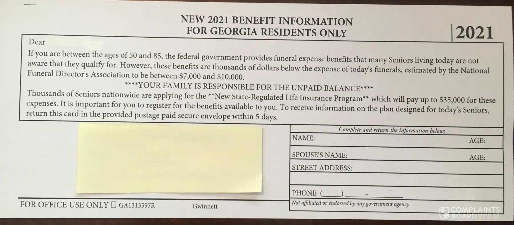 My Uncle and I each received a solicitation letter from American Senior Benefits that implied that signing up for their program would give you benefits that would pay for your funeral expenses so that your family isn't burdened with that expense. It is clearly worded in a deceiving manner to 1) make you think that it is MANDATED, even though the word they use is state-REGULATED, 2) think that this is an absolutely for-sure benefit due to you. The outer envelope was marked TIME SENSITIVE to make it seem this was an urgent, important matter.