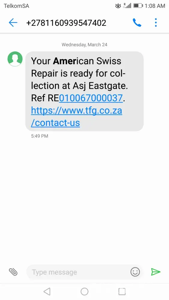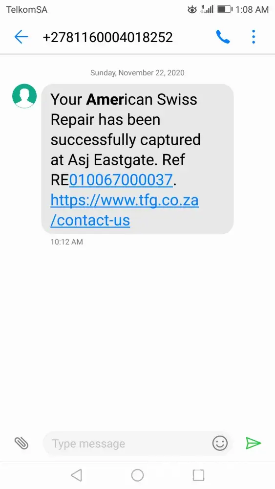 Earlier today @ exactly 10h02 - I receive a call from Noni, she explains to me that she has spoken to the repairs department, not sure what happened but they say that the quote must've not been accepted. I explained to the lady, I have shown her the sms as proof just yesterday which she wasn't really interested in as she had to check via their system anyway... she said yes, she understands what I am telling her but the fight is not from them with me, she was telling me the repairs said they somehow never received the "accept" but they will pick up the item within this week and have it back next week as it is marked as "urgent" once again!