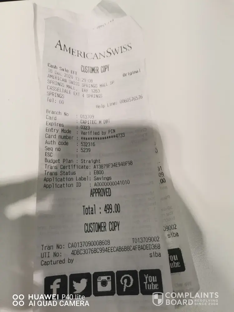 I am hereby logging a complaint regarding the A31 Samsung phone I purchased at Stellenbosch Mall with an account, the phone is faulty not functioning on the touch screen I tried to return it back to American Swiss in Hazyview it's been a while now.