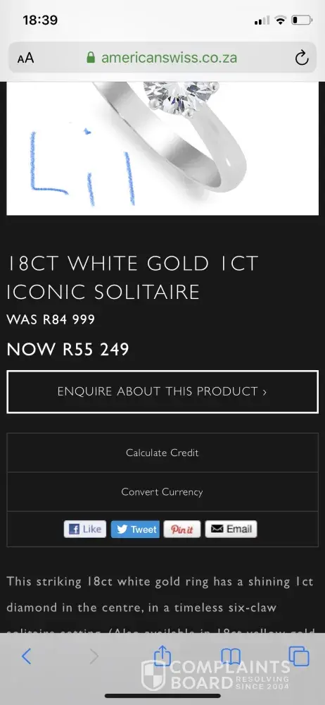 So with that being said, I would like to be refunded the value at which I purchased this ring. I have opted to first communicate this to the head office of American Swiss, which I believe will assist accordingly. If otherwise, I can explore other avenues of consumer dissatisfaction which may tarnish the reputation of the organisation.