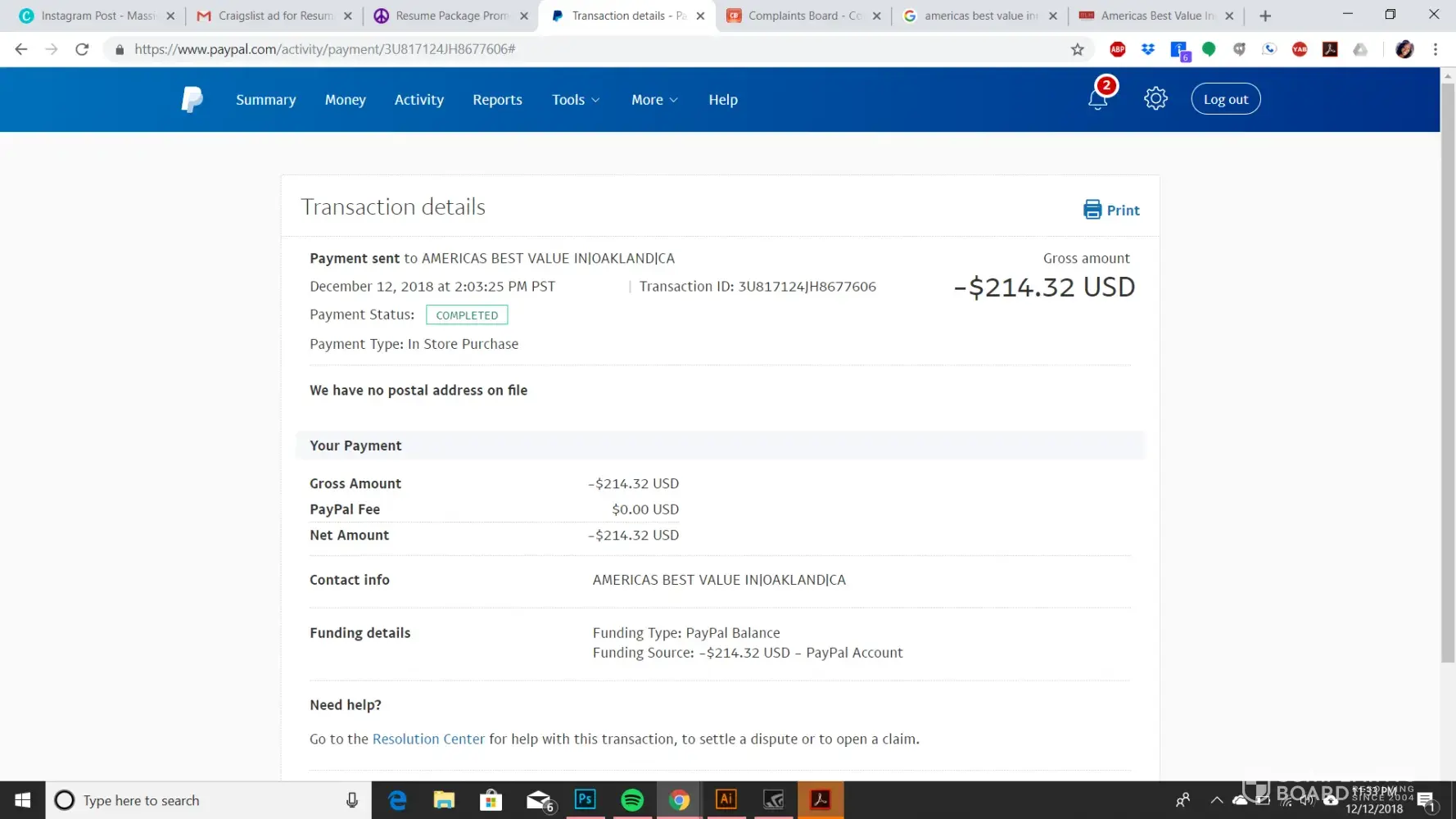 I got charged $214.32 on my paypal account i haven't been there in over a month and paid for every stay for the week i was there back in October i called and they claim they could find my transaction and to call back when the manager was there.