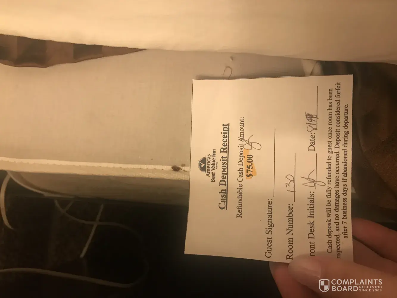 the room was completely nasty. stains on the shower floor stains on the shower wall. the floor on the side of the bed up in the corner all the way along side of bed was completely nasty curly q hair dirt food look like coffee grounds. the AC is leaking on the floor so they just placed a piece of plywood down instead of properly fixing the AC so it doesn't leak inside the framing is leaning downward so that the water wants to flow inside instead of out. there is no filter or screen on the out side of the ac. so whenpeople sit outside and smoke it sucked it right in.and there's no restriction no seal with no filter to hold the bugs out I had to kill three or four little jumping spiders that were coming up the wall and ceiling from the AC daddy long legs. mosquitoes were coming in. when we got into bed there was cookie crumbs or food of some sort still in the sheets where they did not change the sheets and there was chocolate stains I'm hoping it was chocolate on the sheets. her being pregnant I didn't want to argue with her so we went and bought our own sheets blankets and pillow cases. I feel that this is a total disrespect of representation in disrespect to customers themselves she works hard for her money she was embarrassed to go complain so I cleaned the shower I washed the sinks.. the reservation was under Mary Scanlon my fiance and myself Donald Ireland. I feel that she has totally been ripped off. I feel that she is deserves her money back or at least a couple night stay for the reimbursement.. please respond to [protected] and I do not email much I prefer to talk in person or at least text if you respond to the email i more than likely won't get it.. as I am relearning electronics and find them a nuisance