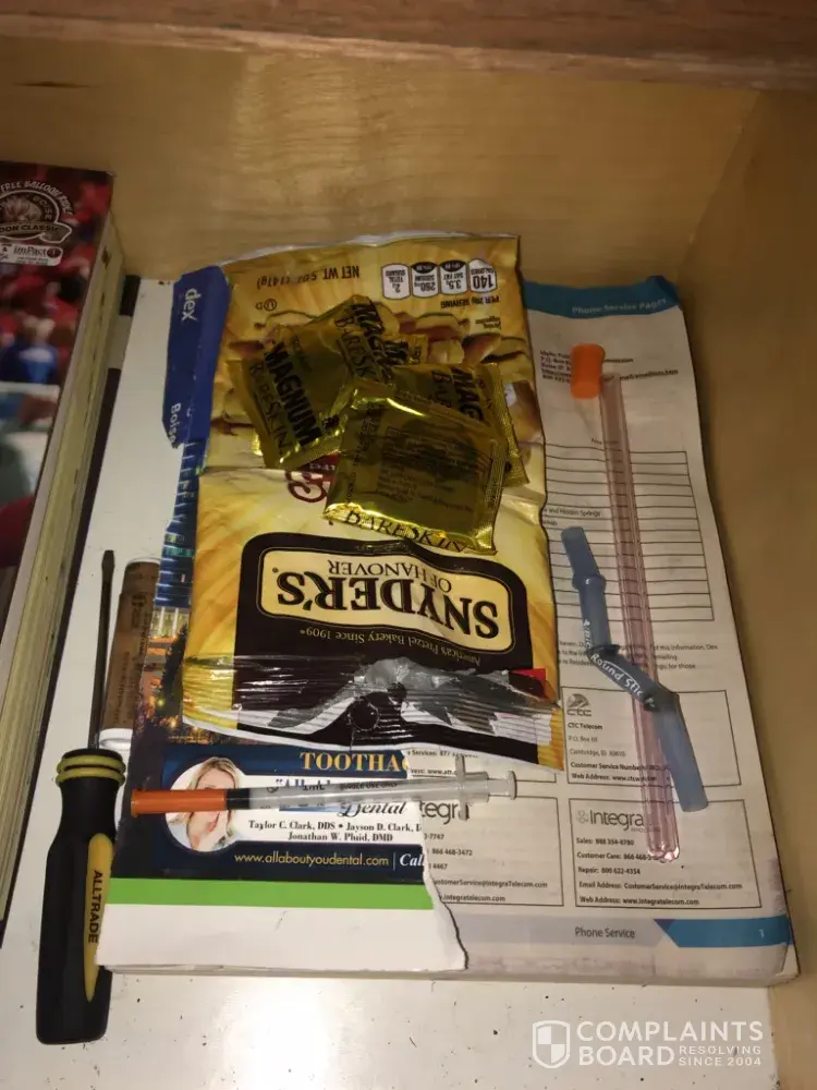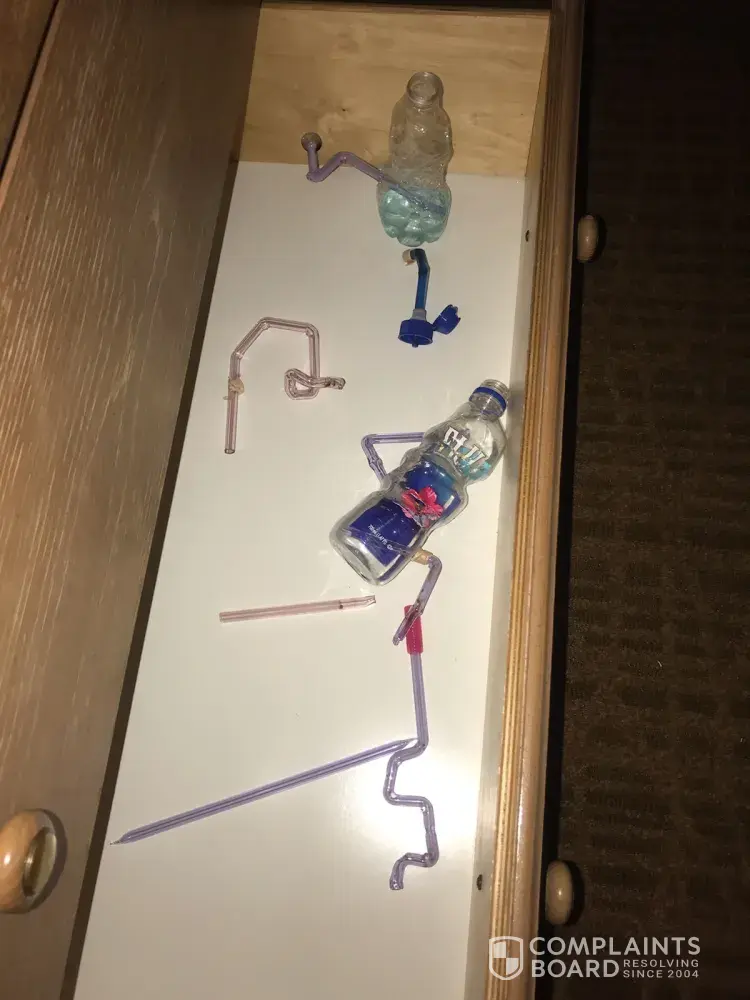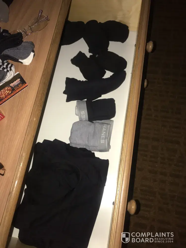 We arrived late at night/ early am, so didn't go to unpack till that night, I opened the night stand and found drug items, in another drawer I found clothes and in and in another I found more drug use items. Obviously they did not clean the room. I was totally shocked and am thankful that my special needs child had not opened those drawers. When I asked for a manager the desk person refused to call one