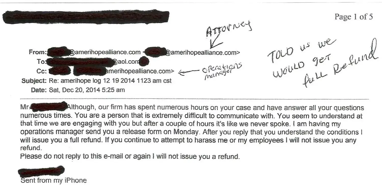 Amerihope Alliance Owner/Attorney emailed me would issue me full refund.