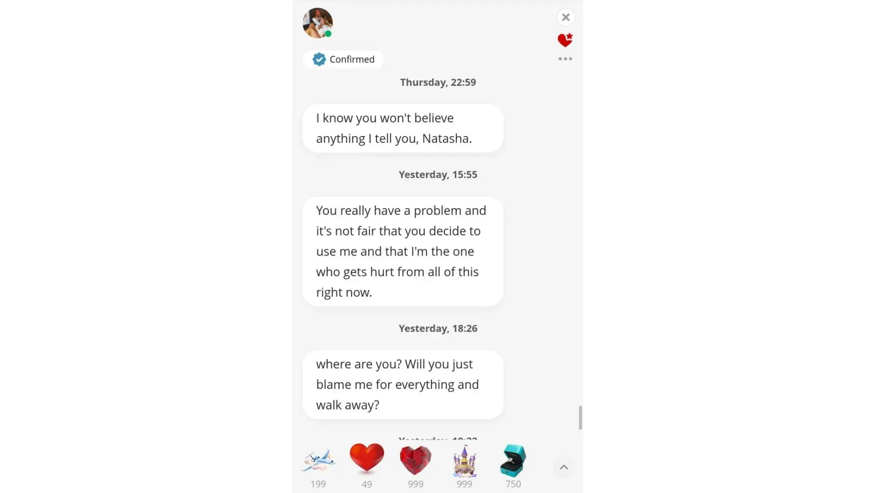 She has done the exact thing to me. Talking about marriage and our future. She has been sending me songs but I wonder how many other people get those same songs. Our stories sound so much the same. When I would catch her doing something she would start the same thing. Message after message, thank you for sending those screenshots. I have plenty of screenshots from our conversation together over this past year. This girl definitely wouldn’t meet us, she has had plastic surgery over the past year too. But she claims her son was talking to me the other day. Asking for expensive virtual gifts but it was her. This blows my mind and I didn’t make anything up. She can be very mean when she wants to be. Just illusion and manipulation