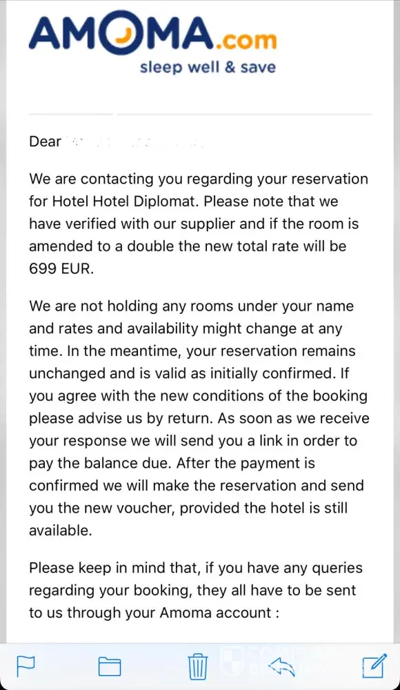 a) – Your booking will become confirmed and final only after receipt of your payment and confirmation is sent by us via an email with your hotel voucher. The booking will be considered confirmed at the time and date AMOMA.com send you the confirmation. However, in the event of a request for booking, our Customer Support team will process your request and your booking will only be confirmed upon receipt of a confirmation and voucher by email from our Customer Support team." So, how can anyone possibly alter a booking because after you've paid and booking is confirmed, you can't cancel it without it costing you the full amount!